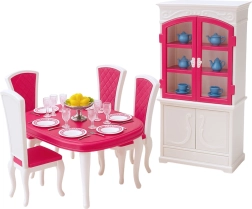 Elegantni set namještaja i dodataka za lutke visine oko 29 cm pretvara svaku kućicu u realističnu blagovaonicu. Sadrži stol, stolice, kredencu s vratima koja se otvaraju i bogatu stolnu opremu. Izdržljivo plastično izvedenje, ružičasto‑bijna koloristika i klasičan stil potiču kreativnu igru, razvoj socijalnih vještina i uloga. Usklađeno s normama CE i EN71.