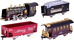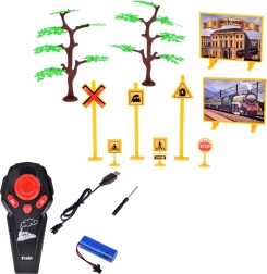 - lokomotiva, vagon za ugljen, putnički vagon, teretni vagon, ravne i zakrivljene tračnice, RC upravljač 2,4 GHz, akumulator, USB punjač, bočica za vodu