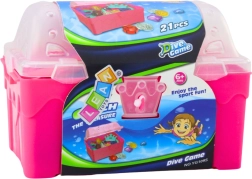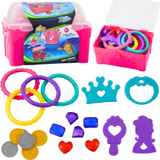 Otkrijte čaroliju vodenih avantura sa setom blaga za vodu. Ružičasta škrinja skriva plastične kovanice, nakit, krunice i dragulje koje djeca mogu skrivati i izvlačiti. Dijelovi su lagani, izrazito šareni i lako se hvataju u vodi.
