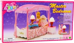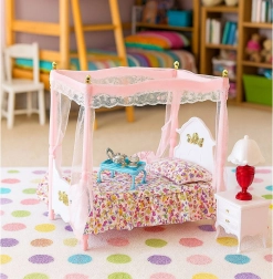 Uz ovaj stilski set namještaja stvorit ćete lutkama ugodnu i luksuznu spavaću sobu. Dominira krevet s romantičnim baldahinom i nježnim zastorima koji cijeloj sceni daje bajkovitu atmosferu. Precizni detalji i skladna ružičasto-bijela paleta mame na igru i stilska aranžiranja.