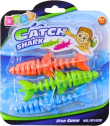 Set sadrži plavog, zelenog i narančastog morskog psa – jarke boje olakšavaju pronalaženje pod vodom i čine igru preglednijom.