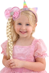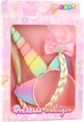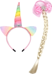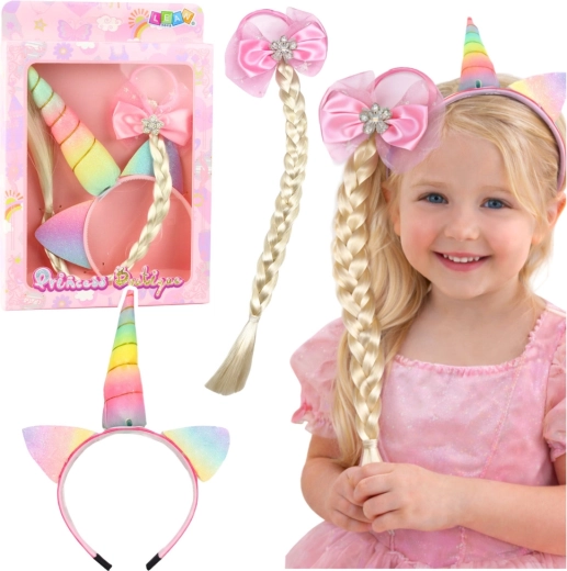 Dječji set Jednorog idealan je za male ljubiteljice mašte. Traka s rogom i ušima daje svakoj frizuri bajkovit izgled, dok gumica s dugom pletenicom i izraženom ružičastom mašnom stvara nježan, djevojački akcent. Materijali su lagani i ugodni kako bi set bio komforan i siguran i pri duljem nošenju.