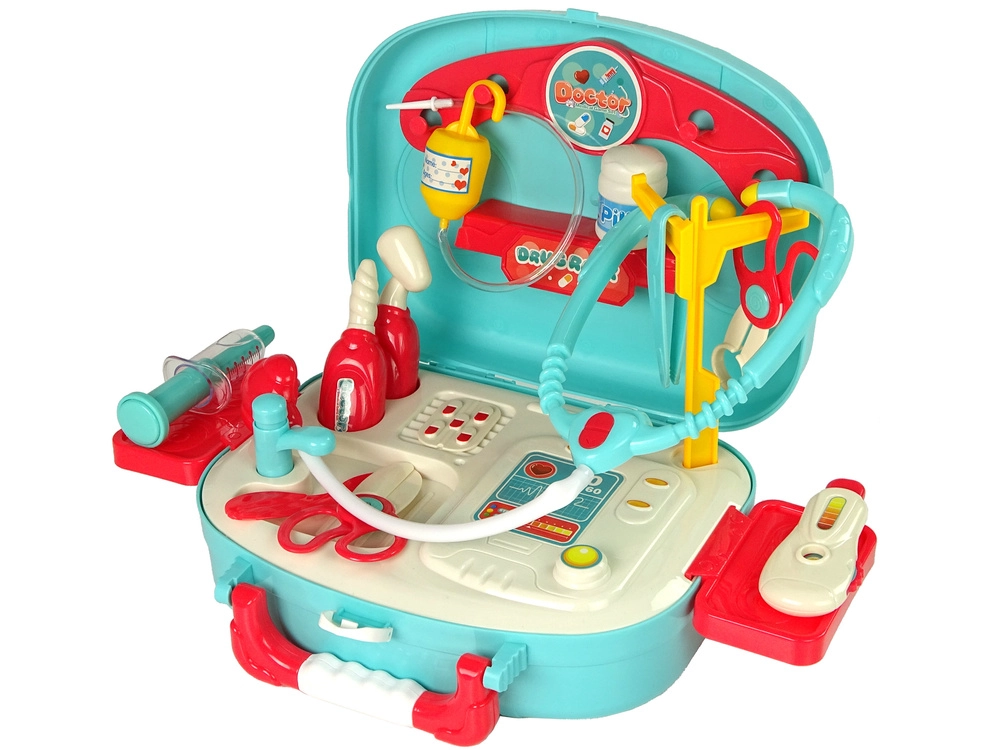 Zabavan i edukativan liječnički set za djecu u praktičnom tirkiznom koferu potiče maštu, učenje i prevladavanje straha od liječnika. Sadrži stetoskop, štrcaljku, toplomjer, škare i druge dodatke s sigurnim, zaobljenim oblicima. Idealan poklon za male liječnike od 3 godine.