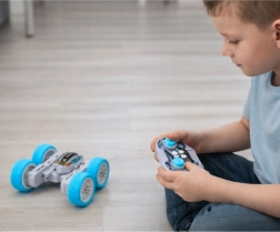Daljinsko upravljanje omogućuje vožnju naprijed/natrag i lijevo/desno, dok LED svjetla naglašavaju show pri svakom kaskaderskom triku. Igra razvija koordinaciju, opažanje i finu motoriku djece, a zahvaljujući integriranim akumulatorima auto je spreman za akciju nakon kratkog punjenja.