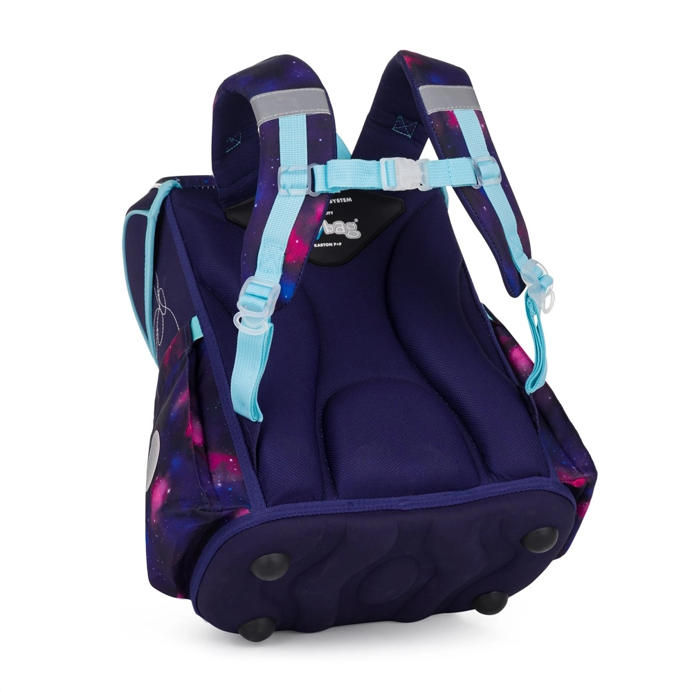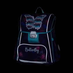 Stilizan školski set za 1.–2. razred s motivom Leptir sadrži ergonomsku aktovku, praktičnu vrećicu za papuče i jednostruku pernicu. Aktovka ima anatomski oblikovana leđa, prozračnu podstavu i široke podstavljene naramenice za udobno nošenje. Nudi prostranu komoru za školski pribor, čvrsto dno protiv prevrtanja i sigurnosnu kopču s reflektirajućim umetkom za bolju vidljivost.
