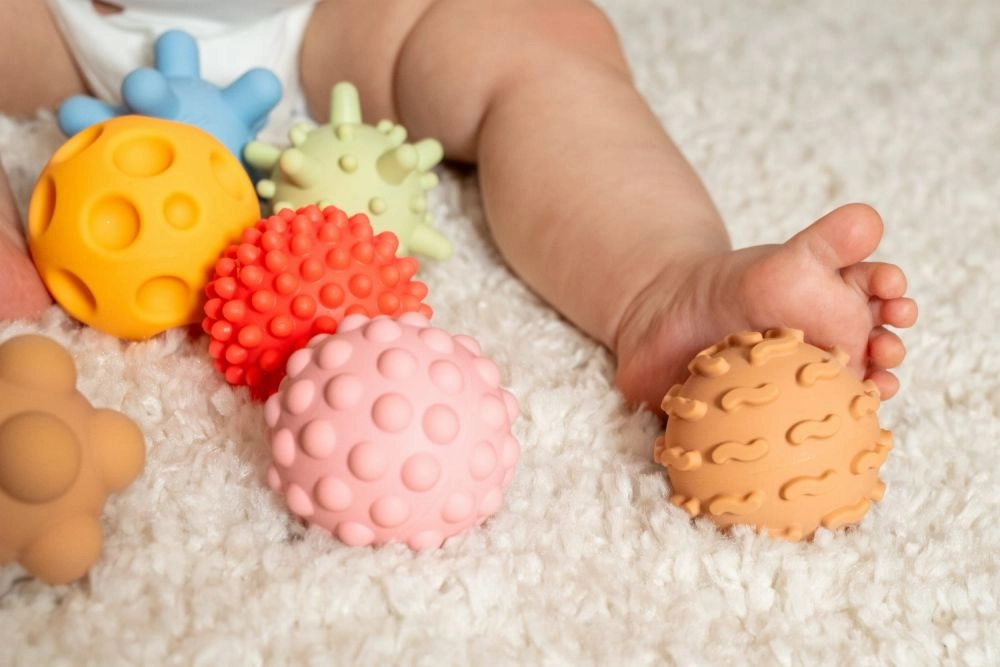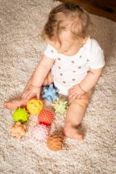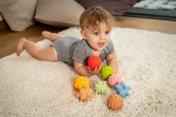 Svaka loptica ima jedinstvenu površinu s izbočinama, čepićima ili žljebovima koji potiču osjet dodira i prirodnu znatiželju djeteta.