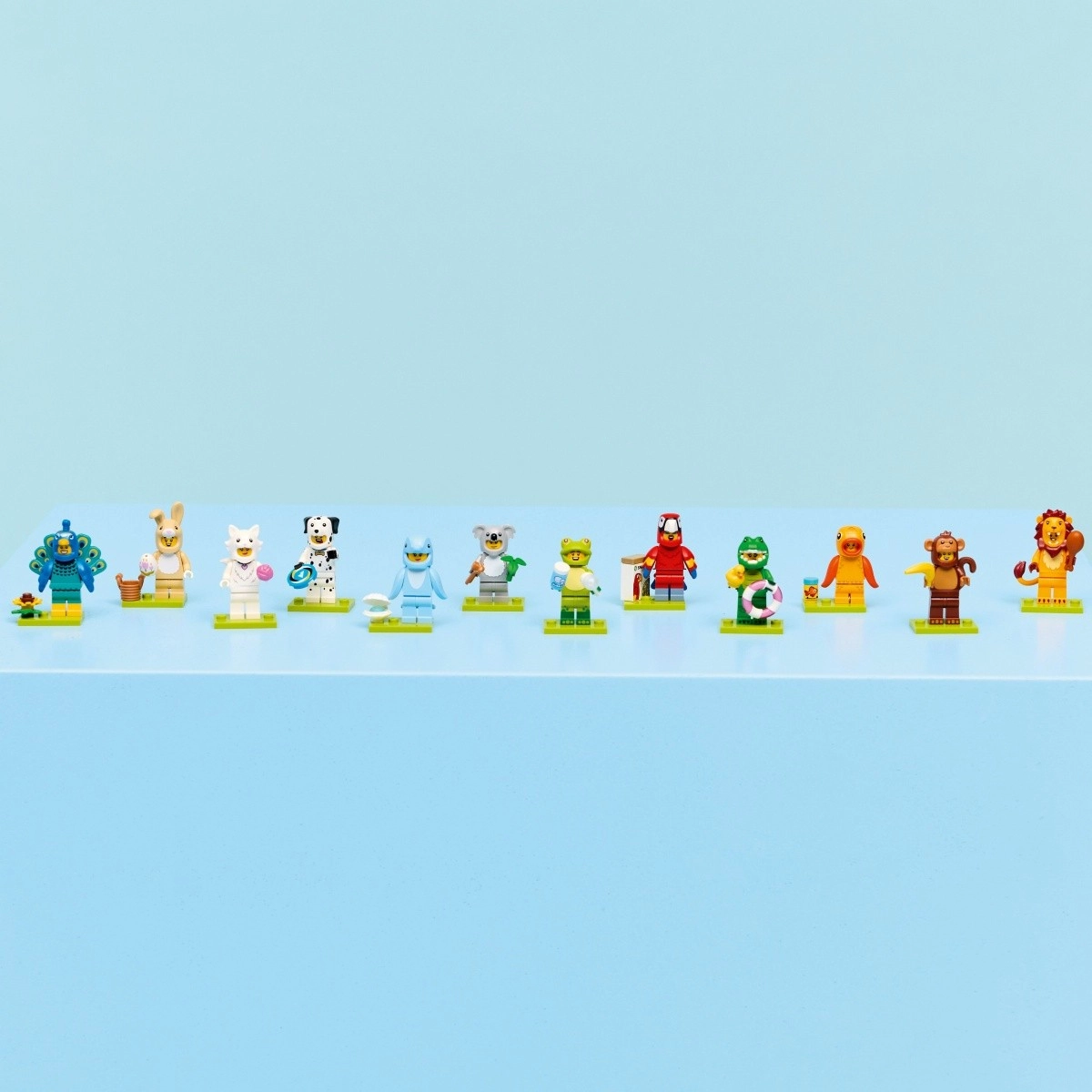 U seriji ćete pronaći likove u kostimima: papiga, lav, žaba, krokodil, dalmatiner, zlatna ribica, slatki zečić, paun, mekana mačka, koala, dupin i majmun. Svaka figurica je skrivena u zapečaćenom tajanstvenom boxu, tako da je iznenađenje zajamčeno – prikupite svih 12 minifigurica i proširite svoju LEGO izložbu ili svijet igre.