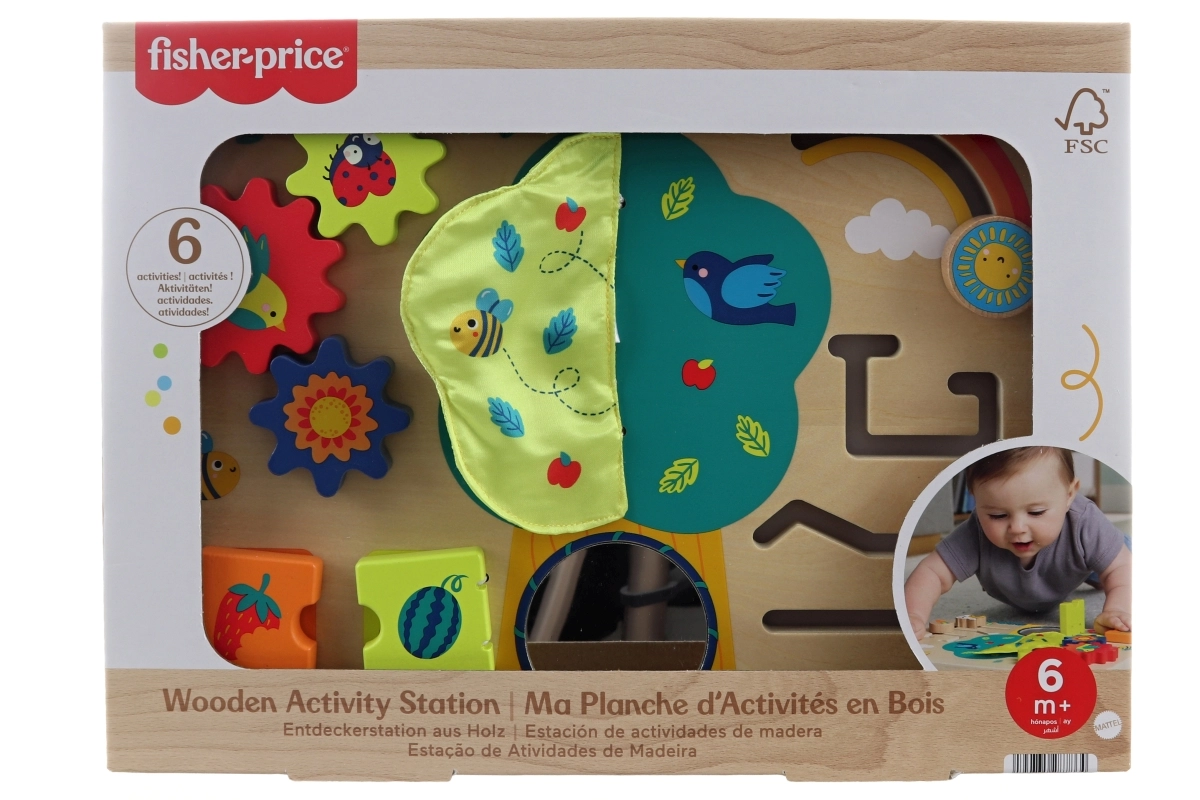 Otkrijte svijet vrta s drvenom igraćom pločom Fisher-Price, koja razvija dječje vještine na zabavan i siguran način. Šest različitih aktivnosti potiče na istraživanje, hvatanje i ispitivanje, pri čemu svaka podržava koordinaciju oko–ruka i prve pokušaje rješavanja jednostavnih zadataka.