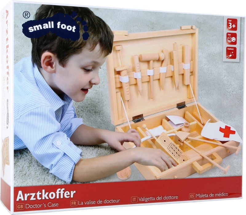 Drveni doktorski kofer SMALL FOOT donosi djeci autentičan doživljaj liječničke ordinacije. U elegantnom drvenom koferu s klasičnim doktorskima simbolima nalaze se mali liječnički instrumenti, igraći telefon i štrcaljke – sve sigurno za dječju igru. Zahvaljujući kvalitetnoj izradi i glatkim rubovima set je idealan za svakodnevnu igru.