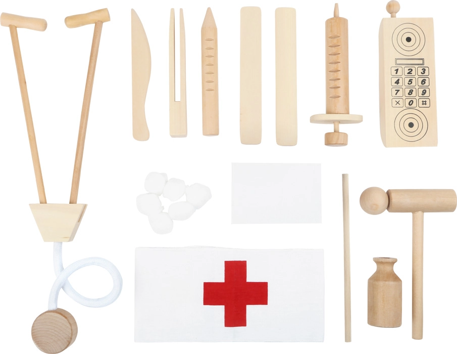 Stetoskop, toplomjer, čekić, štrcaljka i igraći telefon podupiru realističnu igru doktora te razvijaju maštu i socijalne vještine.