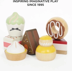Unesite slatku atmosferu u dječju igru s elegantnim drvenim stalkom za torte LE TOY VAN. Ovaj kvalitetan dodatak za dječju kuhinjicu nudi tri kata za posluživanje, 7 detaljno izrađenih drvenih deserata i izrađen je od FSC certificiranog drva s netoksičnim bojama na bazi vode. Siguran je za djecu, bez plastike i potiče kreativnost, maštu i finu motoriku.