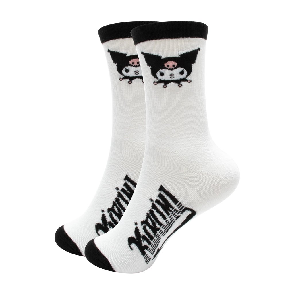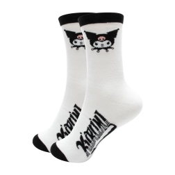 Bijele čarape s crnim rubovima i grafikom Kuromi. Zahvaljujući mješavini poliestera i elastana dobro zadržavaju oblik i ugodne su za nošenje.