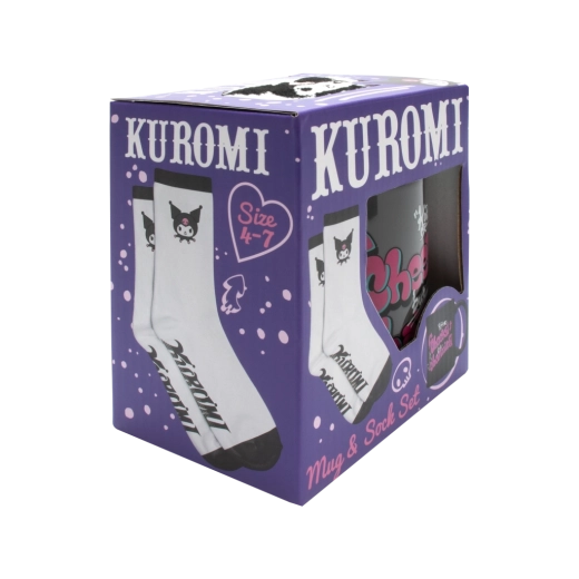 Ovaj darovni set spaja praktičnu upotrebu i razigran dizajn. Keramičku šalicu u tamnosivoj boji krasi ikonična KUROMI u crnom kostimu s ružičastim akcentima te natpis „Cheeky but charming“ u graffiti stilu. Čarape od ugodne pletene tkanine s udjelom elastana lijepo pristaju i slažu se sa šalicom – na nartu je grafika Kuromi, a na stopalu natpis „Kuromi“.
