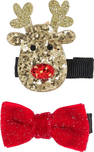 Zaokružite blagdansku frizuru preslatkim kopčama s božićnim motivom. Jednu kopču krasi svjetlucavi jelen u zlatnoj boji, a drugu baršunasta crvena mašnica s nježnim šljokicama. Metalna baza obložena je crnom vrpcom, a zupci osiguravaju sigurno i udobno držanje tijekom cijelog dana.