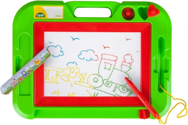 Dječja magnetna crtaća ploča marke LENA potiče kreativnost i finu motoriku. U kompletu su olovka na vezici, 2 magnetska žiga i klizač za brzo brisanje, zahvaljujući kojem djeca lako mogu ponovno početi crtati. Pri pisanju metalnim vrhom obojena površina se mijenja i stvara žive slike.