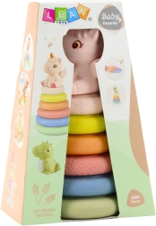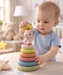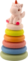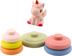 Ova mekana gumena senzorna piramida donosi djeci raznolike podražaje zahvaljujući različitim površinama pojedinih prstenova. Slaganje od najvećeg do najmanjeg potiče logičko razmišljanje, koordinaciju i strpljenje. Jednorog na vrhu zazviždi nakon pritiska, čime budi znatiželju i motivira na ponovljenu igru.