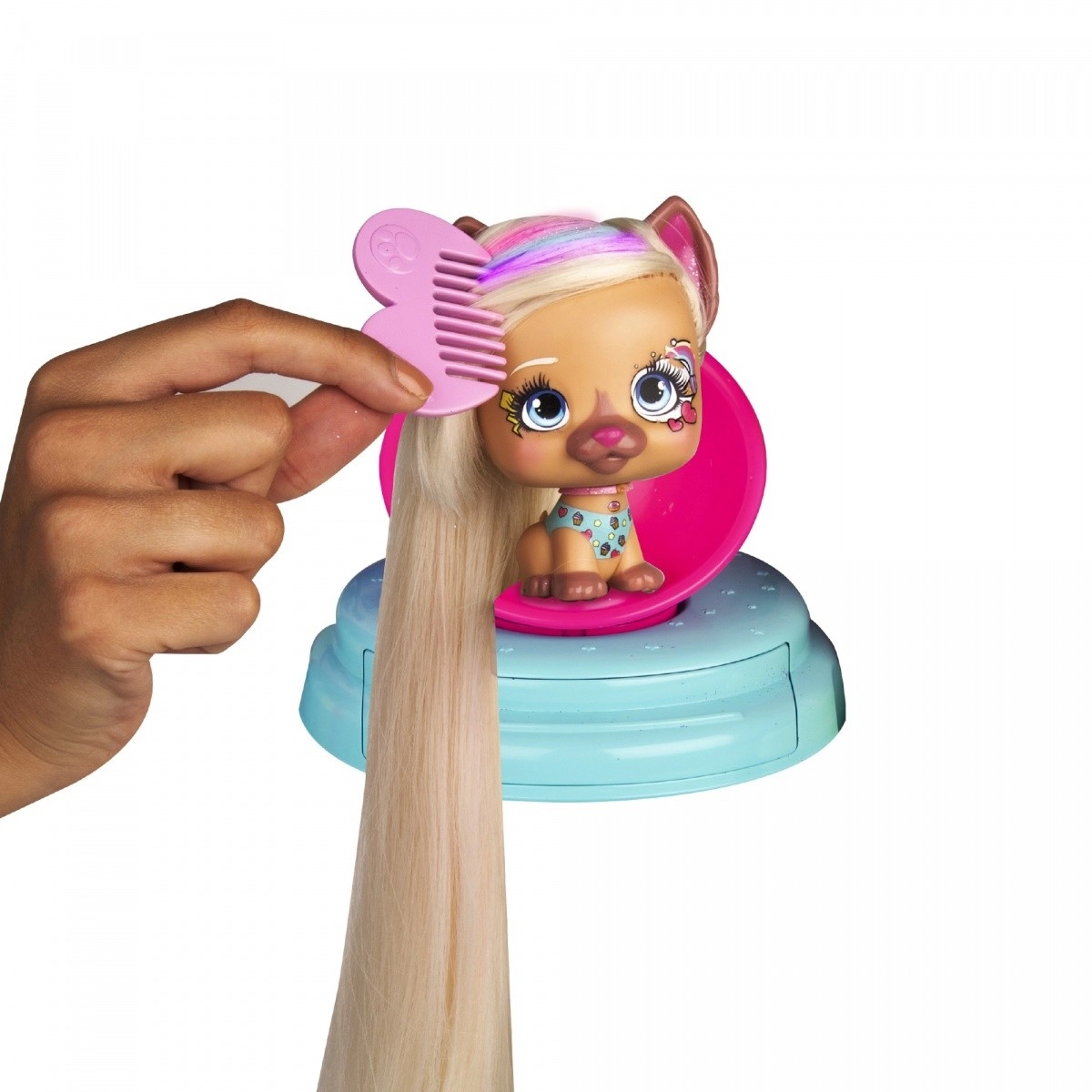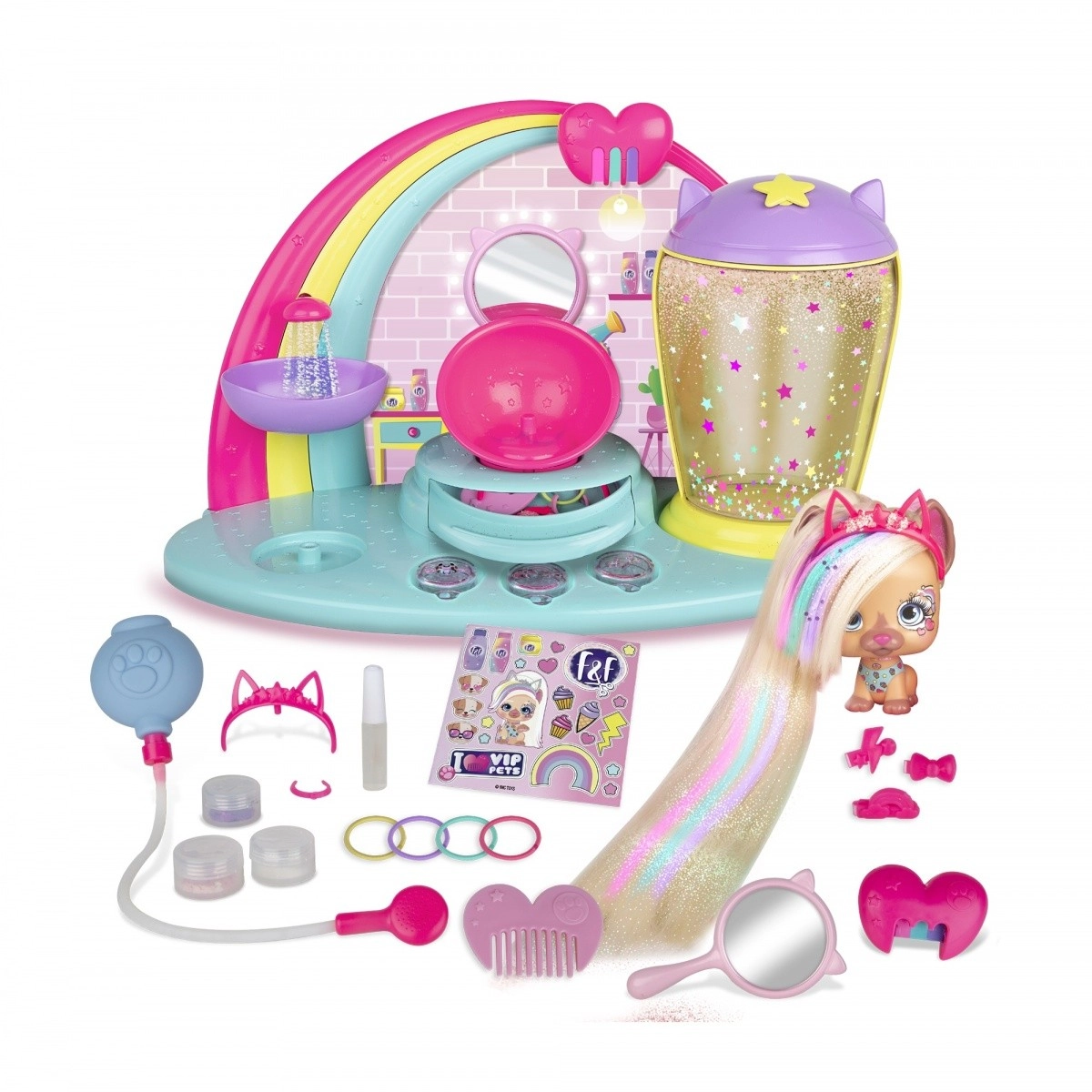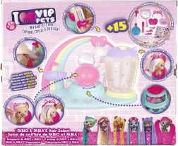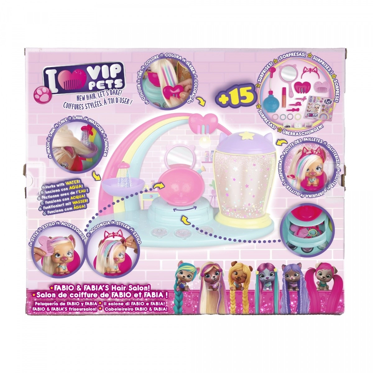 Salon VIP Pets donosi ugođaj omiljene serije ravno u dječju sobu. Glavna zvijezda je pesica Kiara s platinasto svijetlom, 30 cm dugom kosom koju možete prati, bojati, češljati, plesti i ukrašavati. Zahvaljujući funkcionalnoj frizerskoj perilici lako ćete navlažiti kosu, a duginim češljem stvoriti čaroliju obojenih pramenova. U kapsuli sa šljokicama frizuri ćete dodati očaravajući glitter efekt.