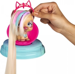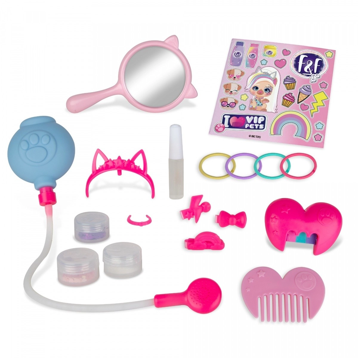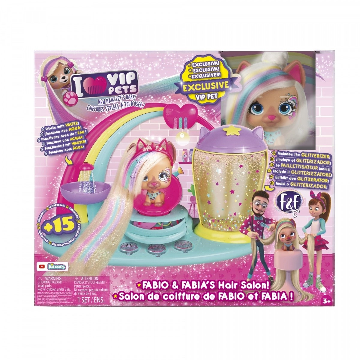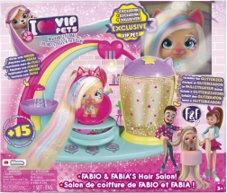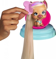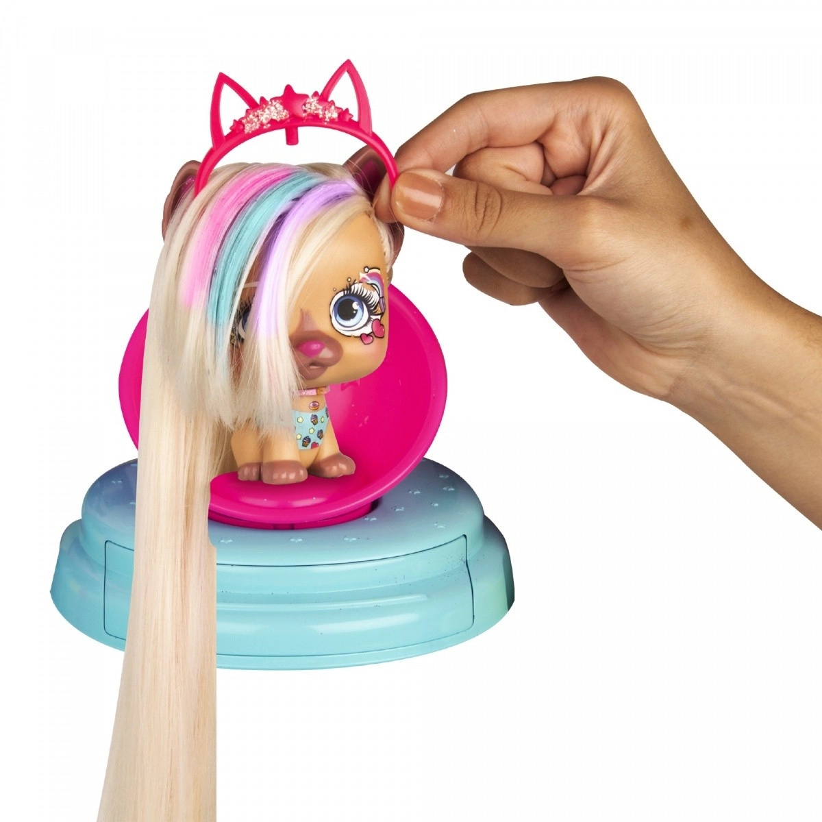 Salon VIP Pets donosi ugođaj omiljene serije ravno u dječju sobu. Glavna zvijezda je pesica Kiara s platinasto svijetlom, 30 cm dugom kosom koju možete prati, bojati, češljati, plesti i ukrašavati. Zahvaljujući funkcionalnoj frizerskoj perilici lako ćete navlažiti kosu, a duginim češljem stvoriti čaroliju obojenih pramenova. U kapsuli sa šljokicama frizuri ćete dodati očaravajući glitter efekt.