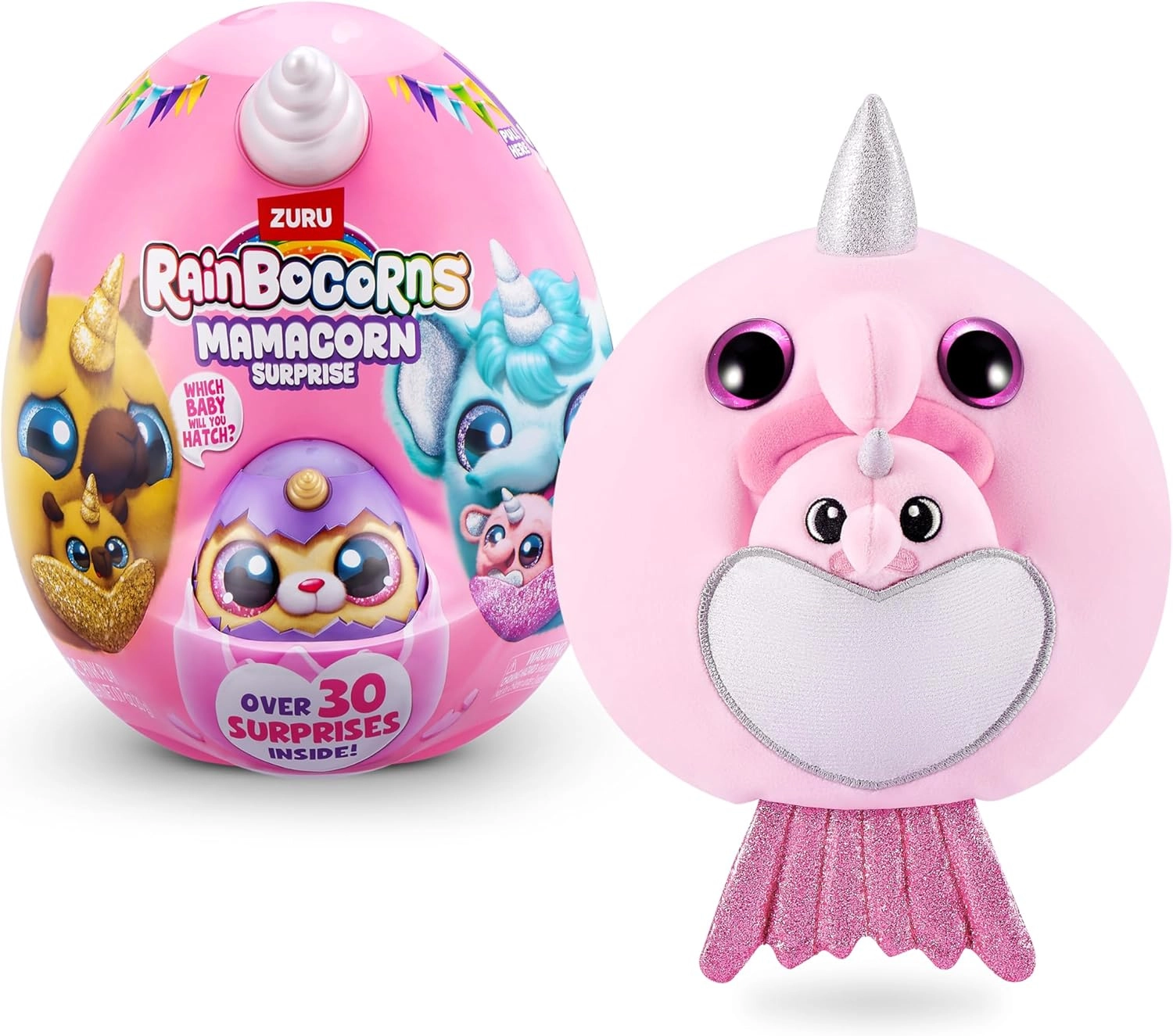 Otkrijte čarobni svijet RAINBOCORNS MAMACORN SURPRISE – veliko ružičasto jaje u kojem vas čekaju mamica Mamacorn s bebon i više od 30 iznenađenja. Mekana, nježna i kolekcionarska plišana igračka s magičnim srcem na trbuščiću donosi sate kreativne i emocionalno ispunjene zabave. Idealan poklon za djecu od 3 godine.
