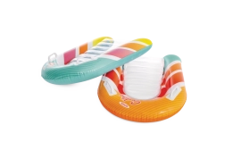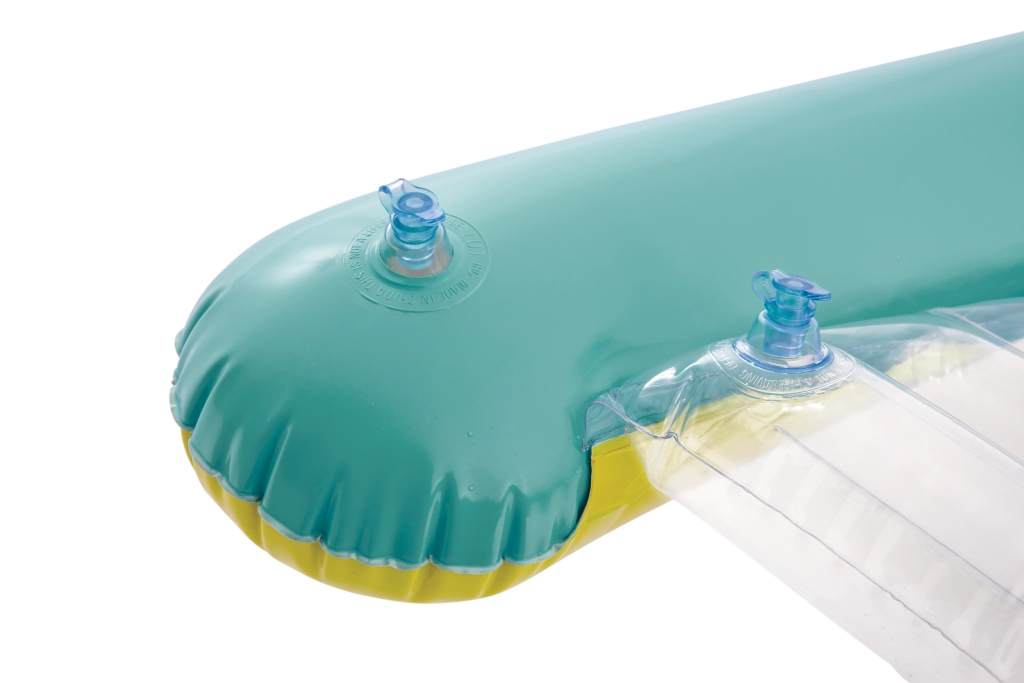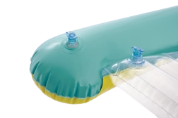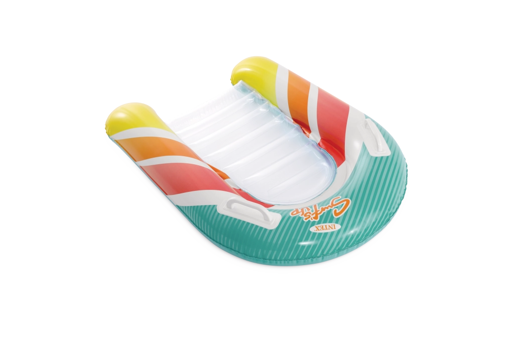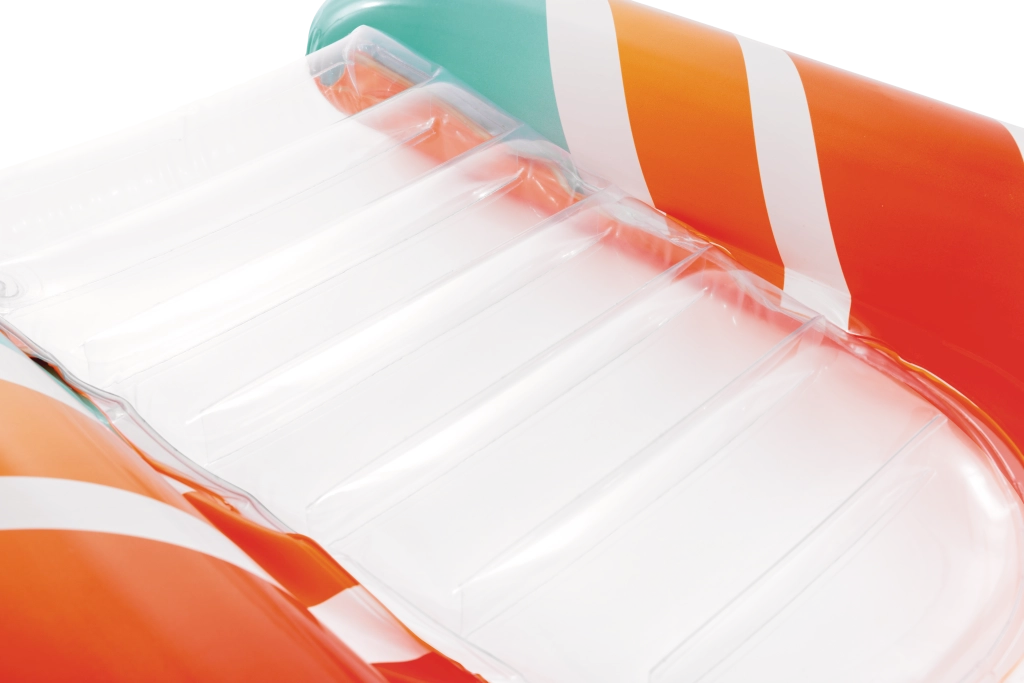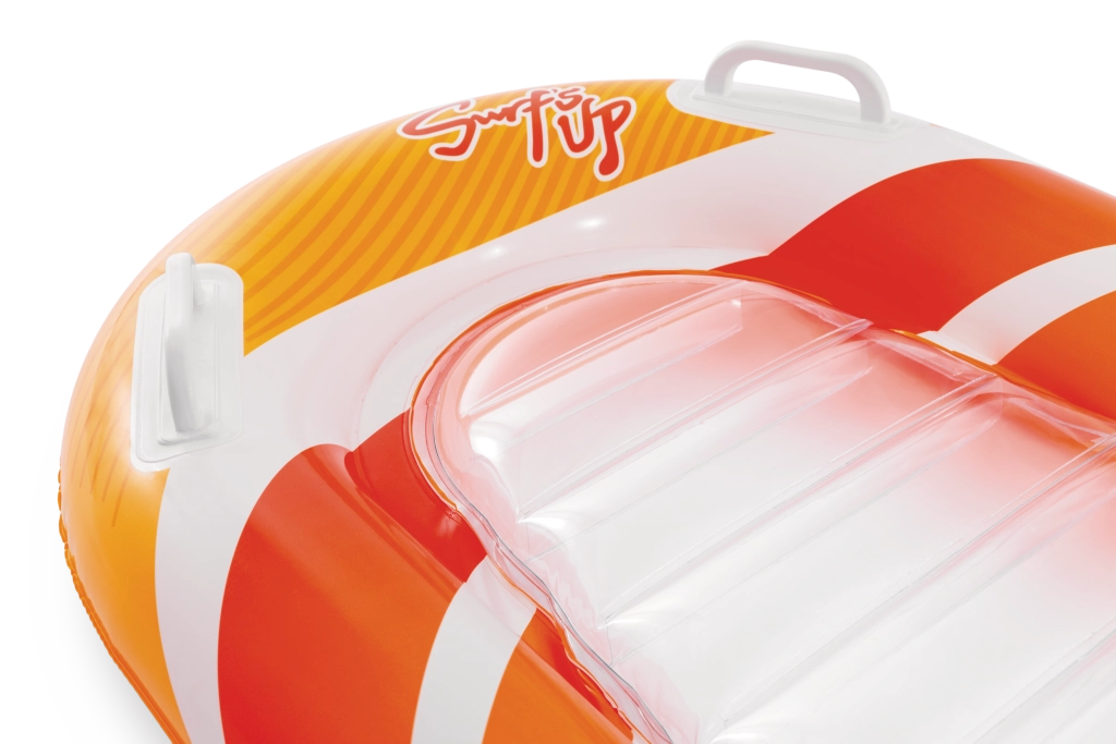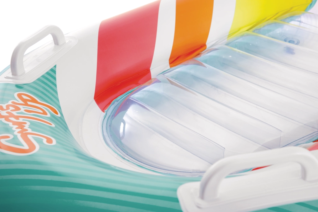 Prozirni, rebrasti sjedni dio pruža udobnost i bolje raspoređivanje težine za ugodan odmor na vodi. Sigurnosni ventili sprječavaju gubitak zraka te olakšavaju napuhavanje i ispuštanje. Ležaljka je dostupna u dvjema varijantama boja – s upadljivo narančastim ili zelenim prugama – kako bi svako dijete našlo svoj omiljeni stil.