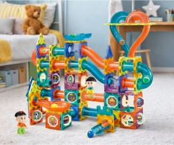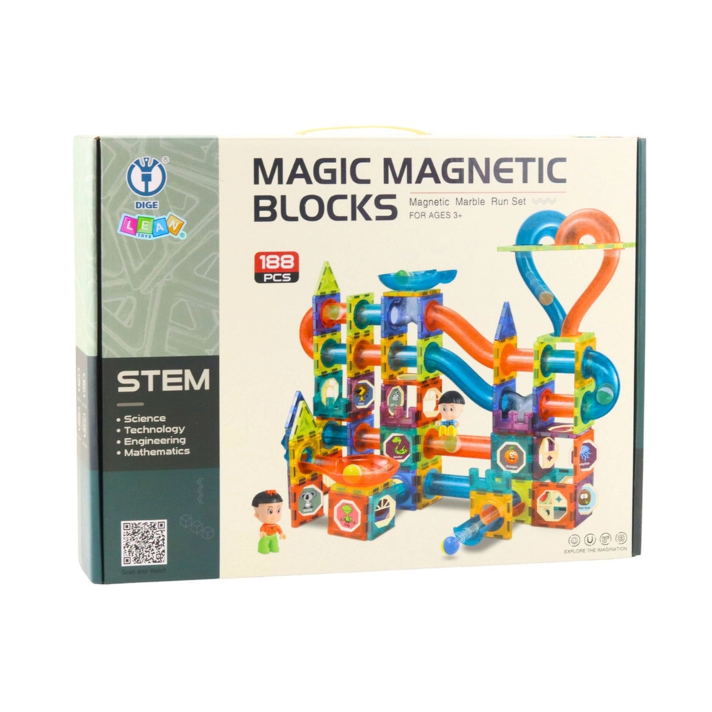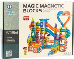 Set MAGIC MAGNETIC BLOCKS spaja kreativnu igru i učenje. Šareni, prozirni dijelovi, cjevčice, zavoji i tobogani omogućuju gradnju originalnih kugličnih staza koje se zahvaljujući magnetnim spojevima mogu proizvoljno proširivati i prepravljati. Igra razvija koordinaciju ruka–oko, rješavanje problema i timski rad.