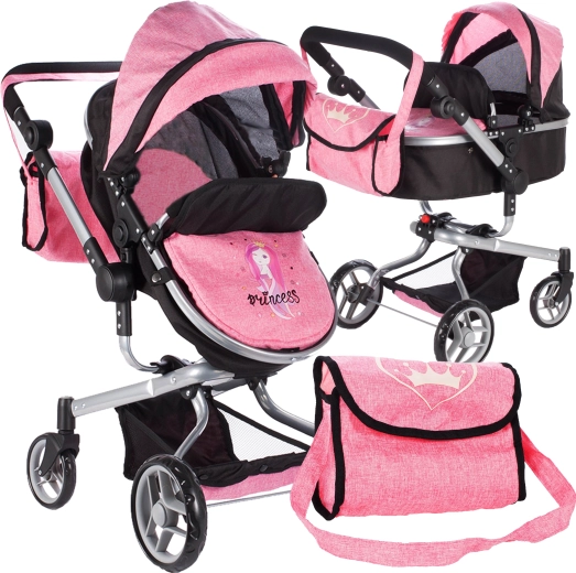 Stilska kolica 2-u-1 za lutke u ružičasto-crnoj izvedbi razveselit će svaku malu mamicu. Nude mogućnost korištenja kao duboka i sportska kolica, imaju podesivu ručku i sigurnosne pojaseve za lutku do veličine 55 cm. Dio seta je praktična torbica za sitnice i donja košara za udobno prenošenje svega potrebnog.