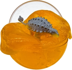 Različite boje sluzi i dinosaurovske figurice u zatvorivoj okrugloj posudici koja održava sluz svježom za daljnju igru.