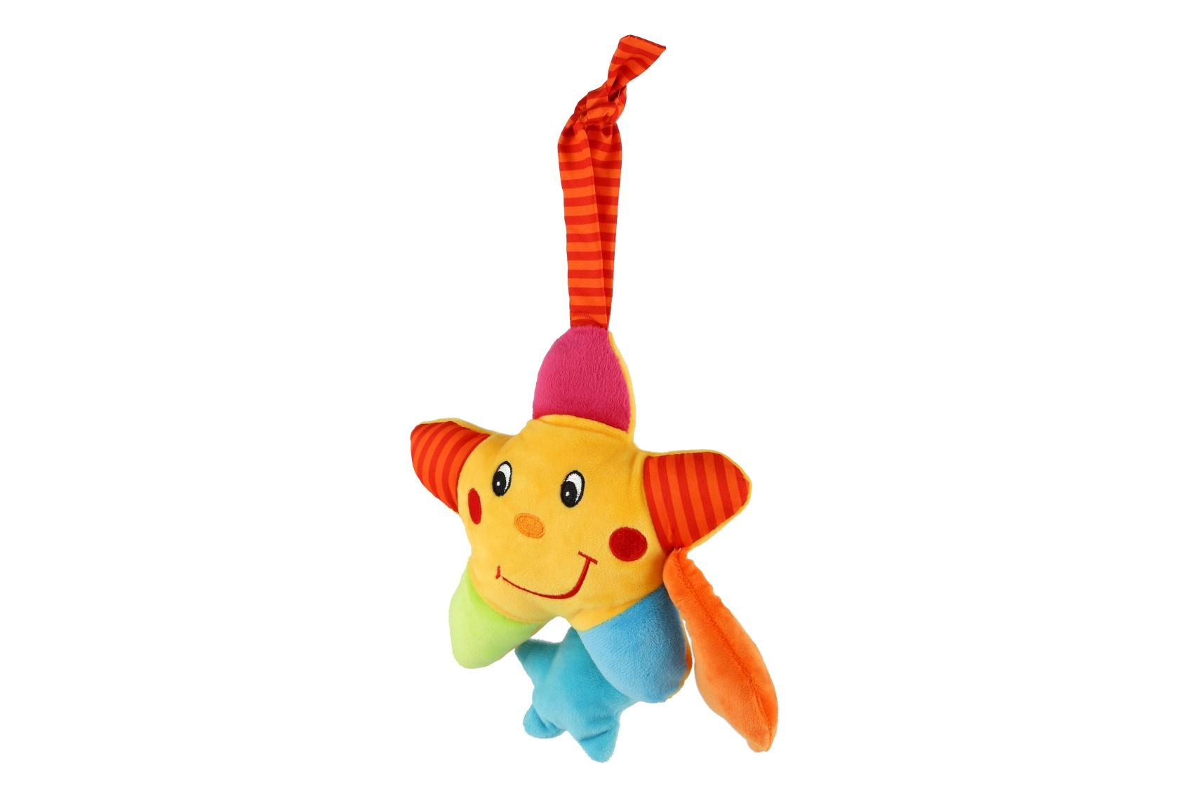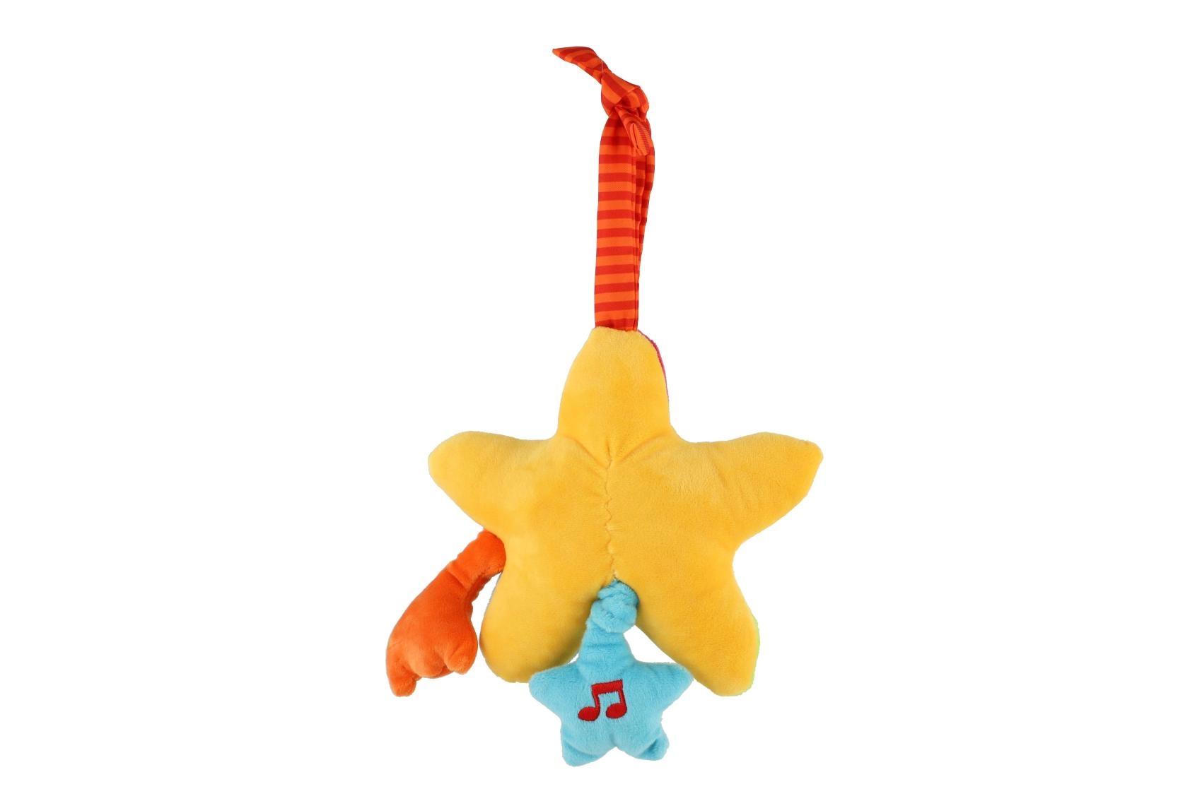 Ova šarena plišana zvjezdica idealna je prva glazbena igračka za najmlađe. Nakon jednostavnog povlačenja za uzicu začut će se tiha melodija koja pomaže bebi smiriti se, usredotočiti i lakše zaspati. Mekana izrada ugodna je na dodir i sigurna za dječje ručice.