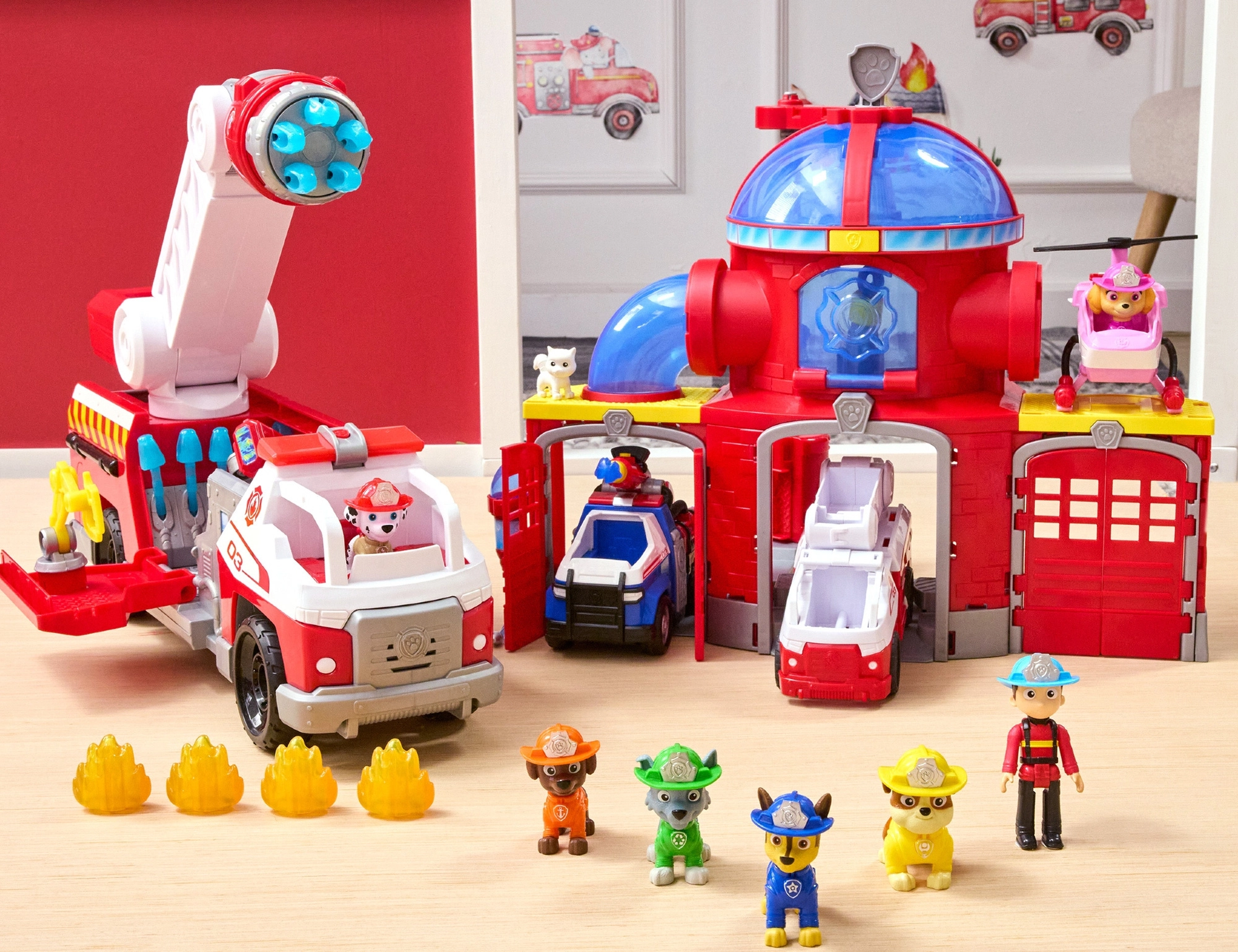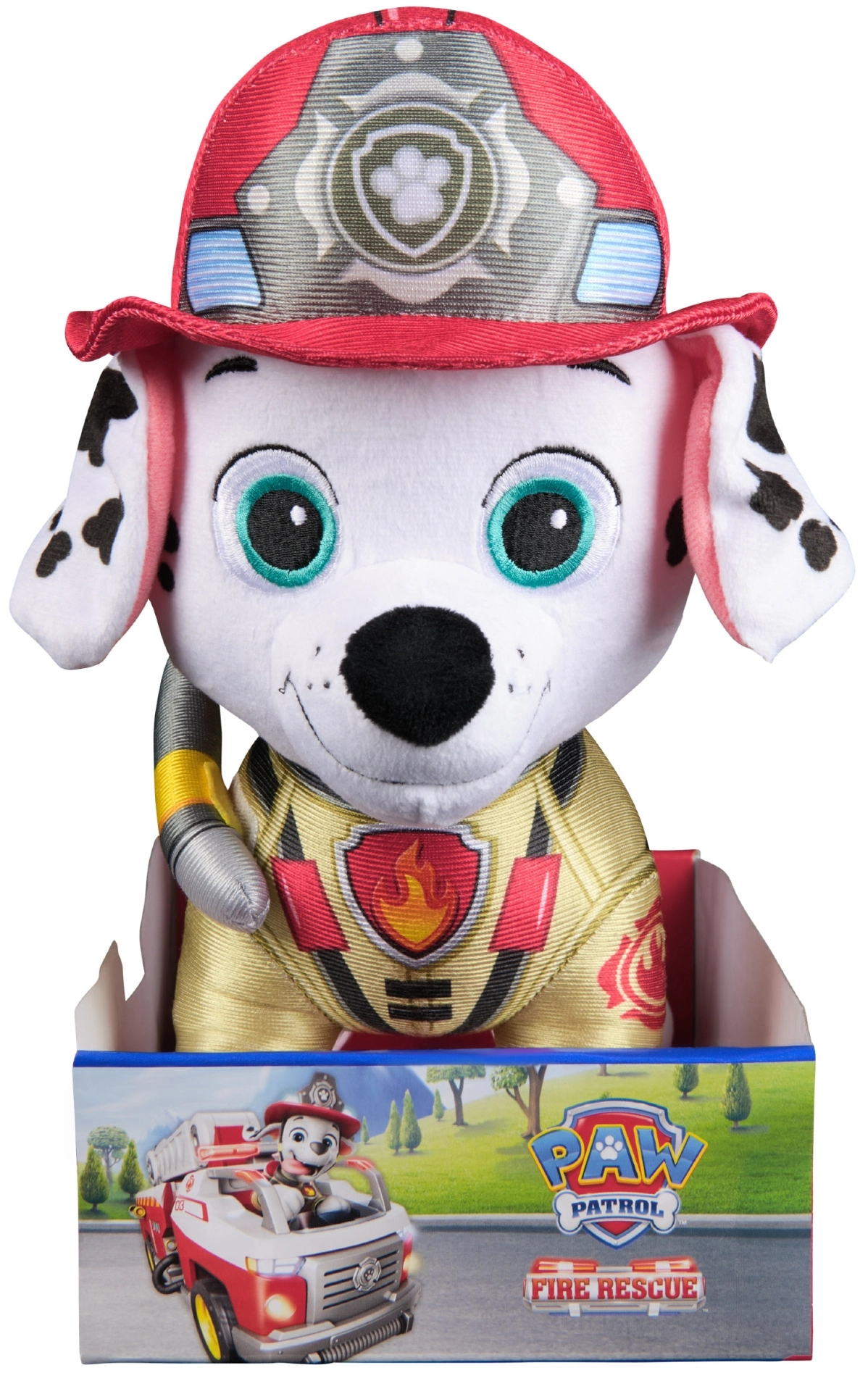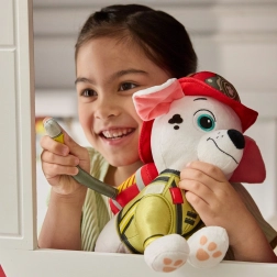 Djeca će obožavati autentičan izgled – bijelo krzno s crnim točkicama, crvenu kacigu, žuti prsluk i mekano crijevo. Sigurne vezeno izrađene oči i detalji bez sitnih odvojivih dijelova čine ga odličnim izborom za igru uloga na temu spašavanja.