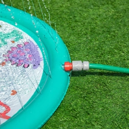 Nakon spajanja na vrtno crijevo voda šprica iz otvora po obodu i stvara osvježavajuću fontanu. Visinu mlaza lako prilagodite pritiskom vode.