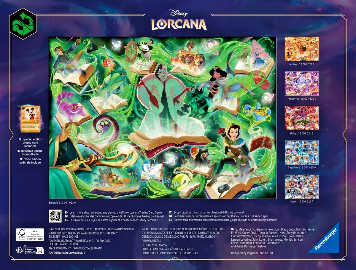 Otkrijte detaljnu ilustraciju iz svijeta DISNEY LORCANA u ediciji Glimmers of the Realm: Smaragd. RAVENSBURGER puzzle odlikuju vrhunska kvaliteta tiska i preciznost izreza, zahvaljujući kojima se dijelovi savršeno uklapaju, a slagalica drži oblik. Završna slika dimenzija približno 70 × 50 cm izvrsno je pogodna za uramljivanje.