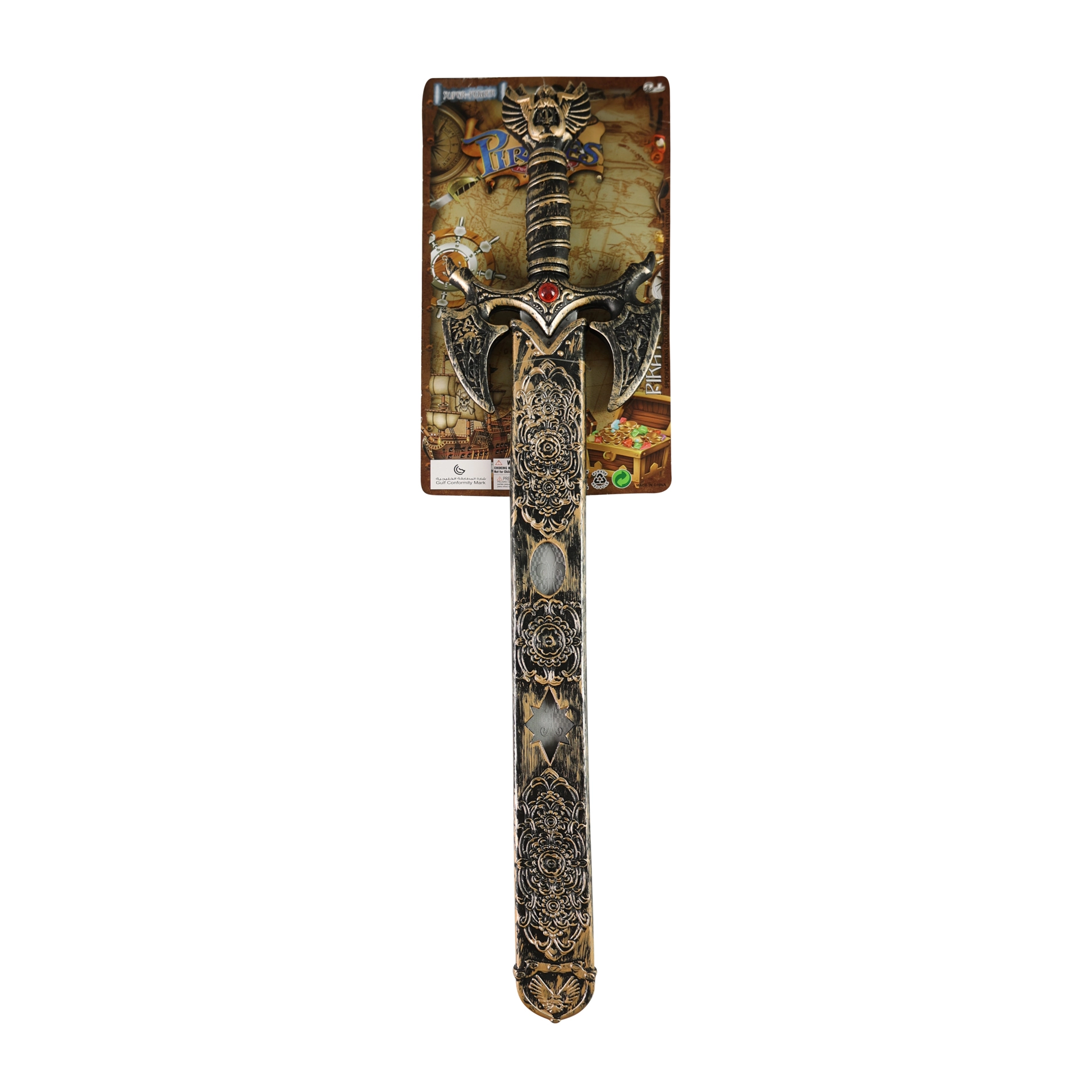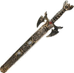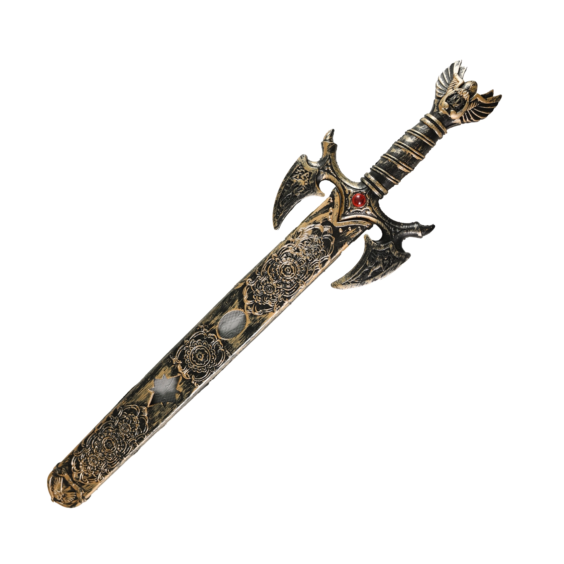 Uđite u svijet mašte s elegantnim viteškim mačem s koricama. Precizno razrađeni detalji na dršci i oštrici, ukrasni reljefi te kombinacija zlatnih i crnih elemenata s kamenčićima za atraktivan izgled. Mač je lagan i udoban za držanje, pa je izvrstan za dječje igre i kostimirane zabave.