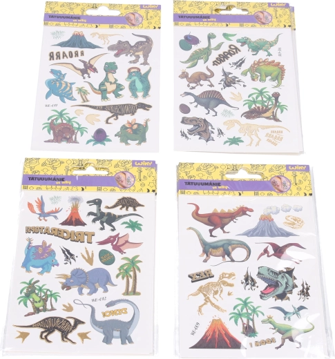 Zabavne tetovažne naljepnice s motivima dinosaura dimenzija 10,5 × 15 cm razveselit će djecu i odrasle. Jednostavna primjena, izražajne boje i 4 varijante motiva za svačiji ukus.