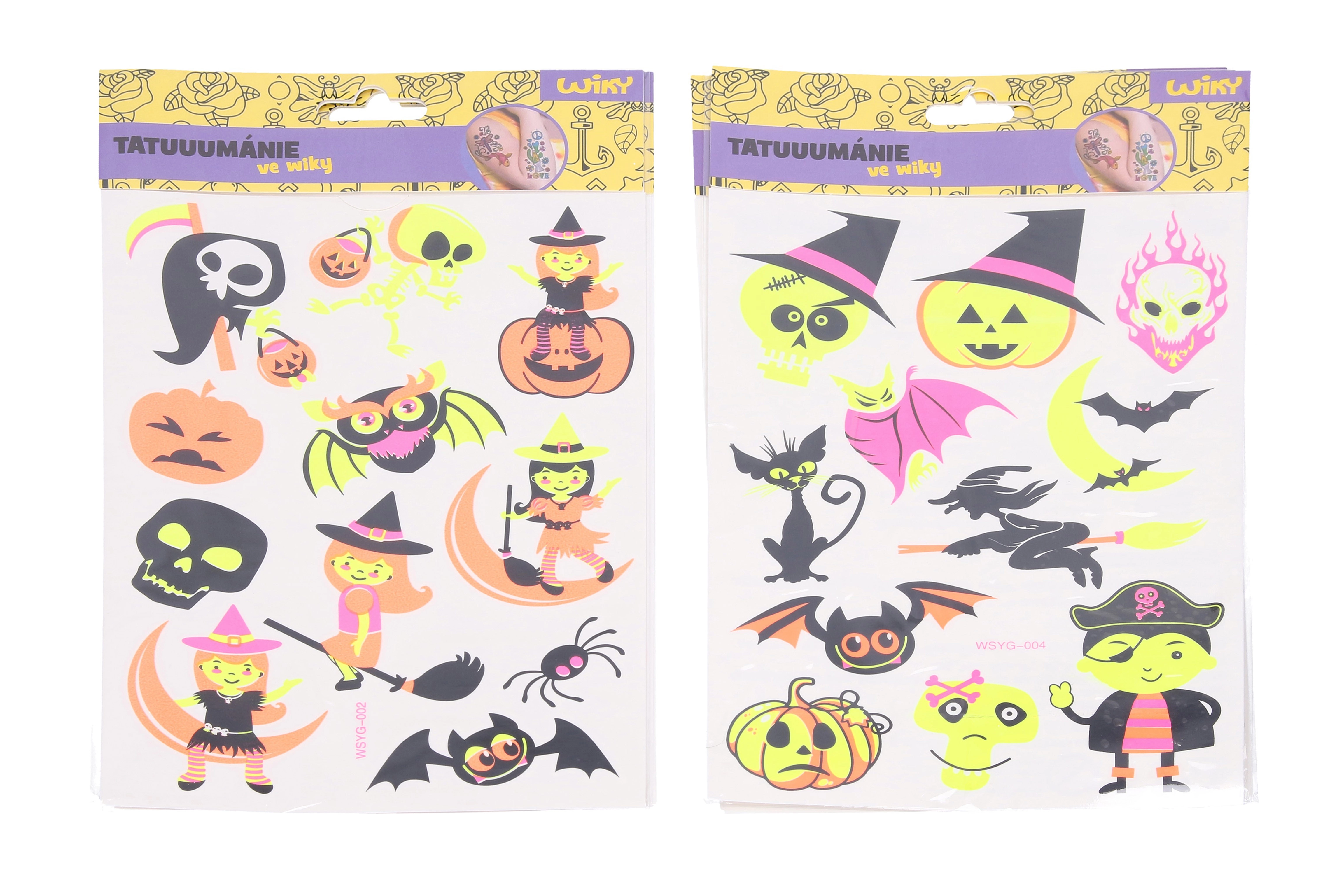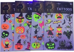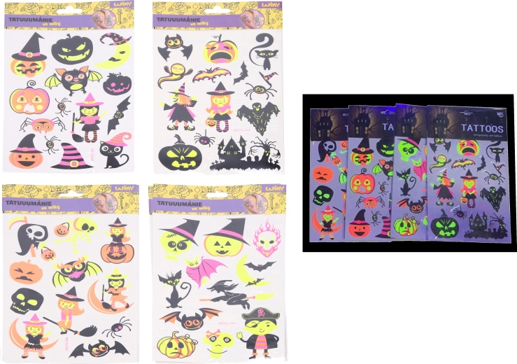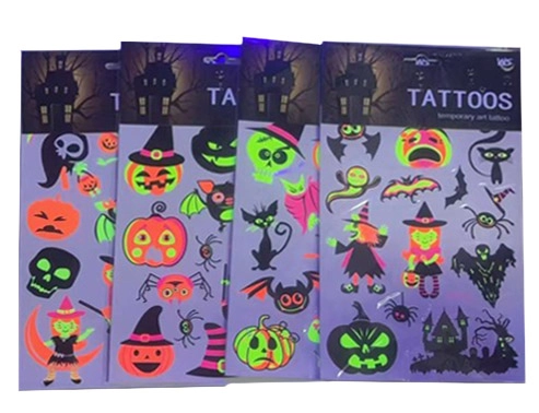 Otkrijte zabavne i sigurne fluorescentne tetovažne naljepnice s motivima Halloweena koje svijetle pod UV svjetlom. Idealne za zabave, karnevale i tematske događaje, lako se nanose i jednako lako uklanjaju. Veličina arka 16,5 × 22 cm, dostupne su 4 varijante motiva.