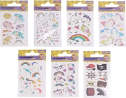 Zabavne dječje tetovažne naljepnice koje u mraku svijetle oduševit će male ljubitelje mašte i avanture. Praktičan format 6 × 10,5 cm i veliki mix motiva jednoroga i pirata odlični su za proslave, poklone i svakodnevnu igru.