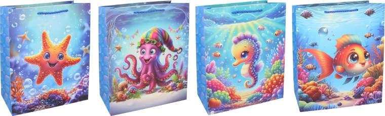 Preslatka dječja poklon-vrećica veličine M s dimenzijama 26 × 32 × 10,5 cm idealna je za pakiranje darova za rođendane, imendane i proslave. Nudi 4 vesela dizajna i čvrstu izradu za sigurno nošenje.