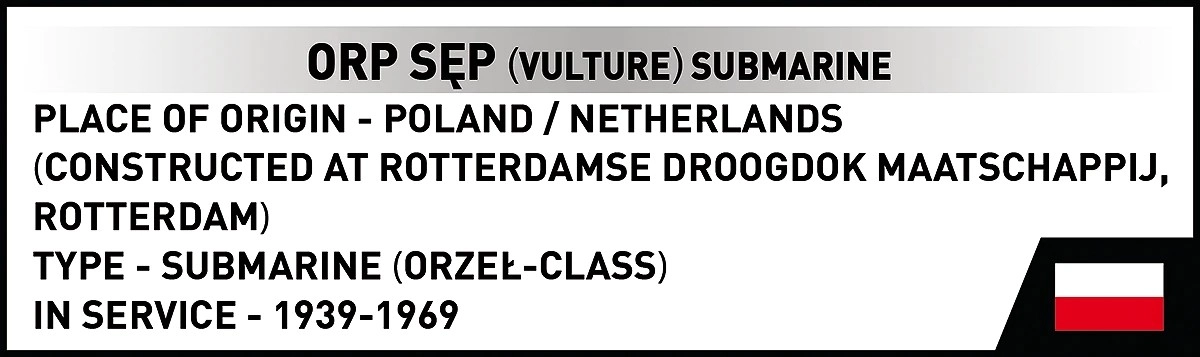ORP Sęp iz serije COBI Historical Collection detaljan je kolekcionarski model poljske podmornice klase Orzeł. Zahvaljujući kompaktnim dimenzijama i pažljivo odabranim obojenim dijelovima, istaknut će se na polici i u vitrini. Set je nastao u suradnji s Pomorskim muzejem u Gdyniji i spaja zanimljivu povijest s preciznom izradom.