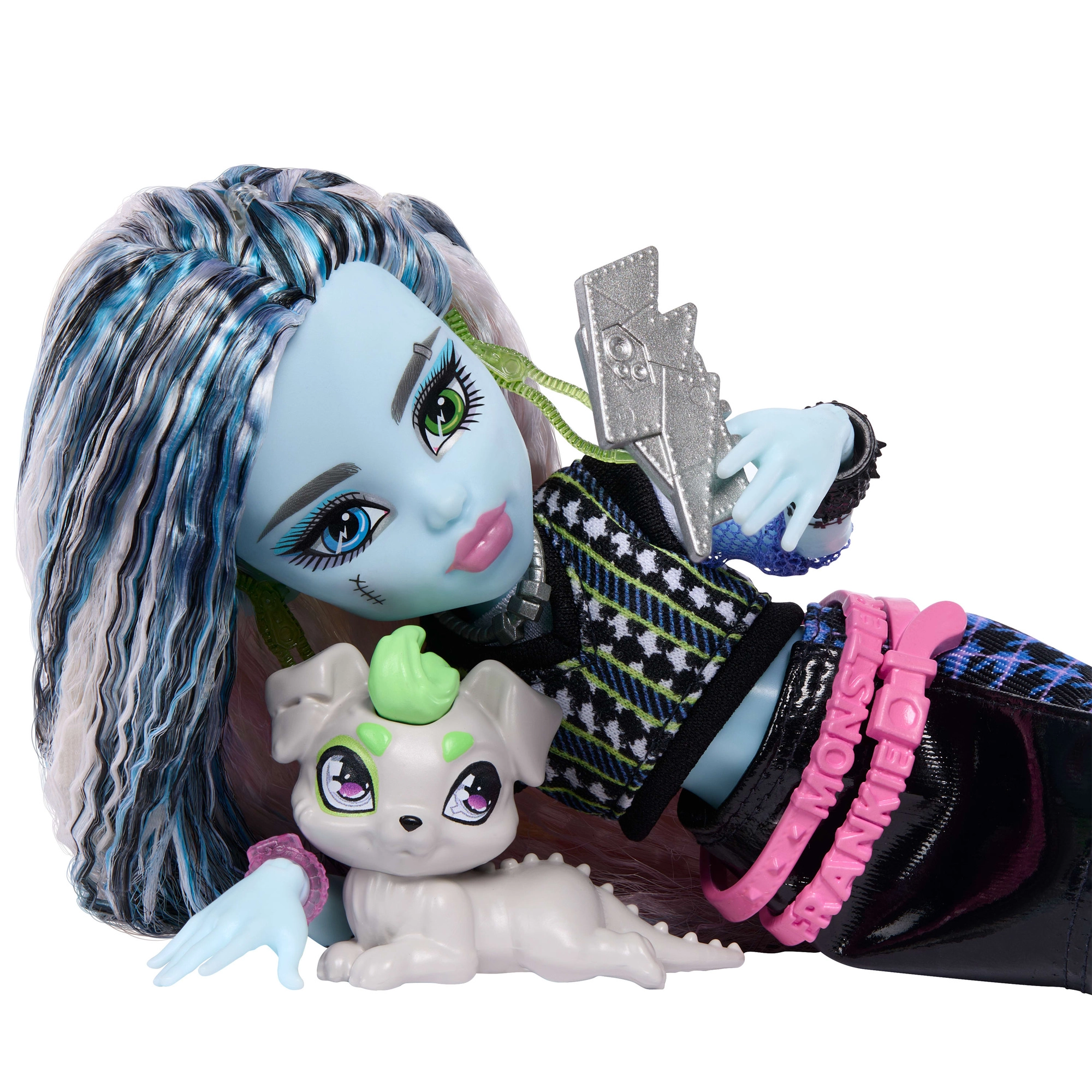 Frankie Stein iz MONSTER HIGH donosi elektrizirajući modni stil od glave do pete. Ima dugu višebojnu kosu, kontrastni outfit s izraženim detaljima i mnoštvo tematskih dodataka – od sunčanih naočala i crossbody torbice do telefona i slušalica. Ne nedostaje ni vjerni ljubimac koji će podržati priče s hodnika Monster High škole.