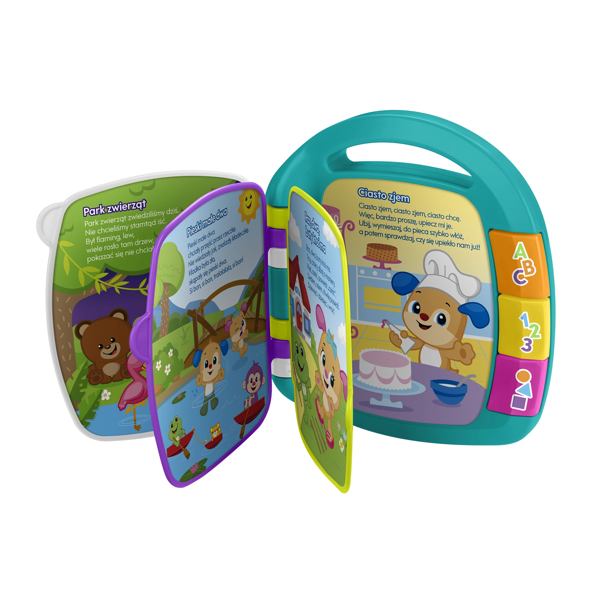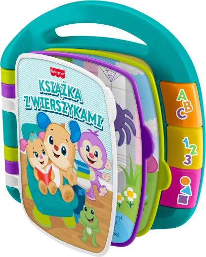 Ova interaktivna knjižica izvrstan je pomoćnik za prve korake u svijetu riječi i ritma. Svako okretanje stranice pokreće recitiranje jedne od 6 pjesmica, dok bočni gumbi prebacuju između pjesmica (kad je knjiga zatvorena) i učenja riječi, brojeva i oblika (kad je knjiga otvorena). Zahvaljujući svjetlosnim i zvučnim efektima zadržava pažnju djece i potiče njihovu prirodnu znatiželju.