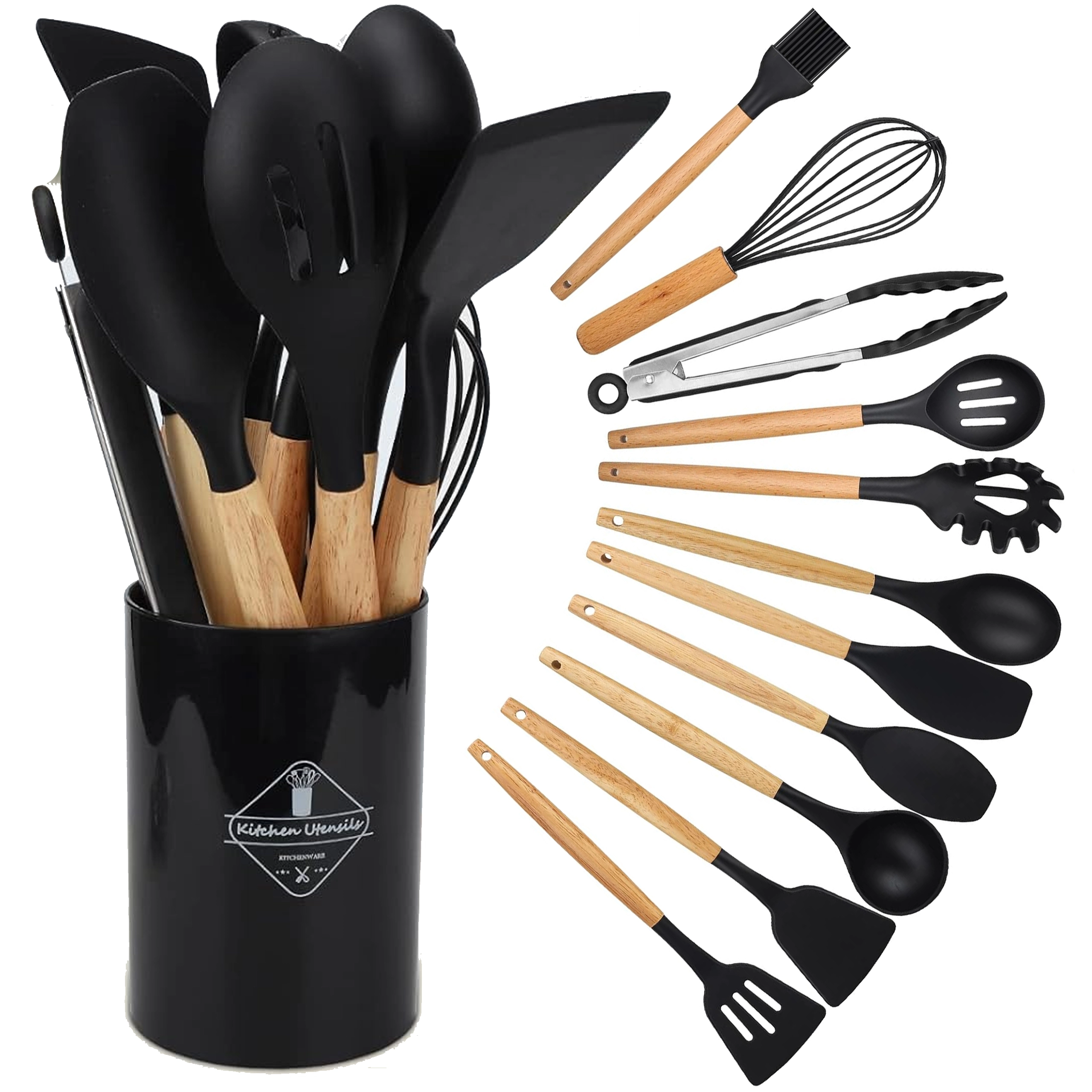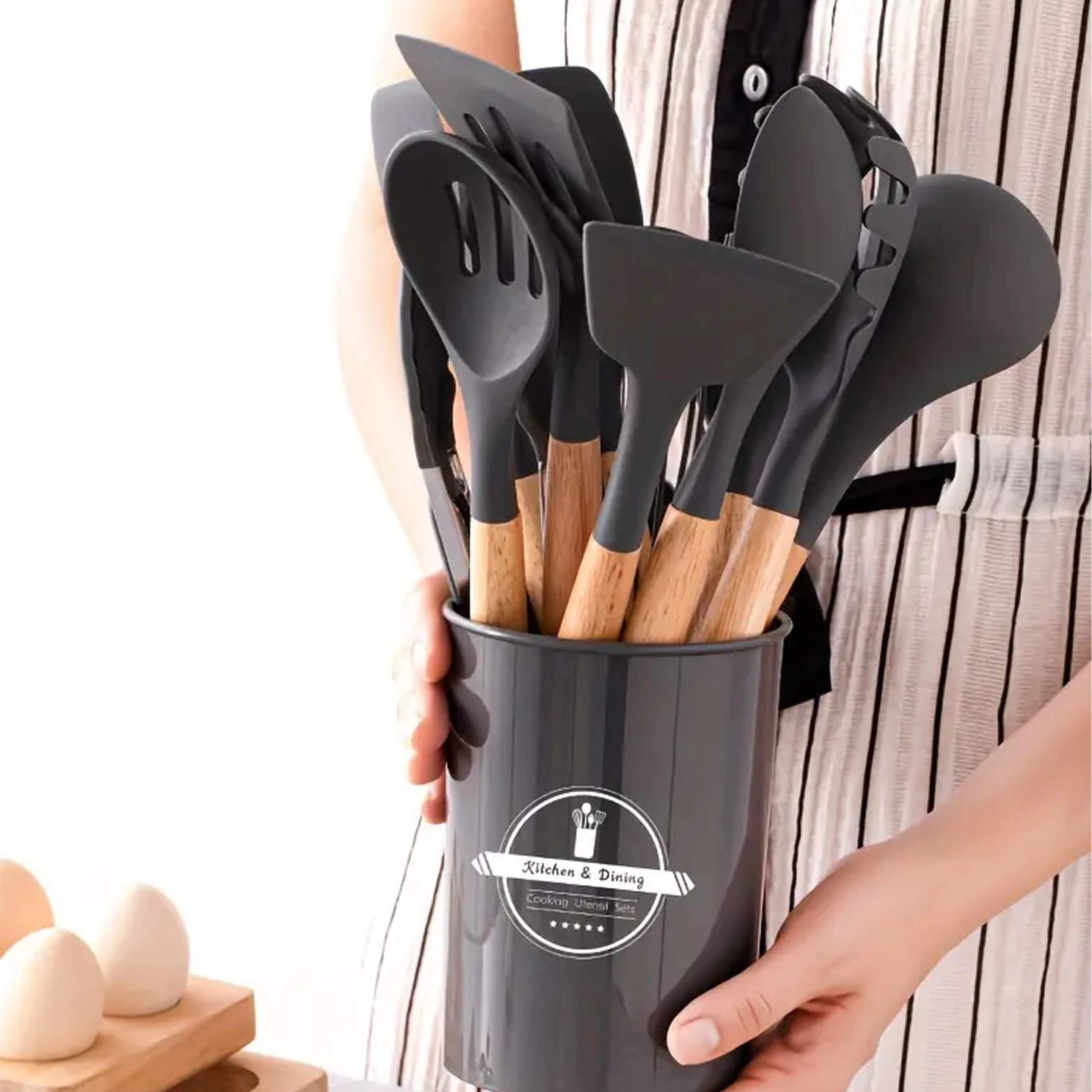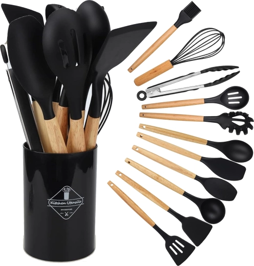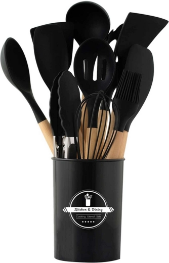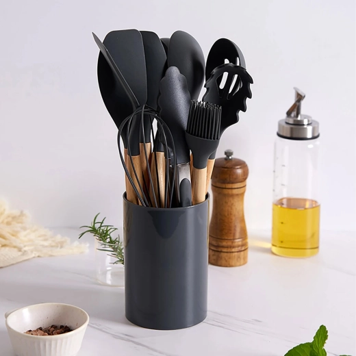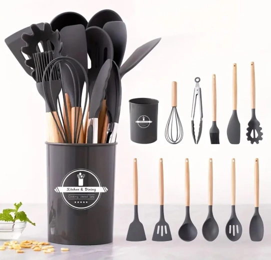 Praktičan set od 12 silikonskih alata s drvenim ručkama za svakodnevno kuhanje. Nježni prema neprianjajućem posuđu, otporni na toplinu, ne grebu površine i nude udobne ergonomske drvene rukohvate. Idealni za miješanje, okretanje, posluživanje i pečenje – sve pregledno pohranjujete u stalak.