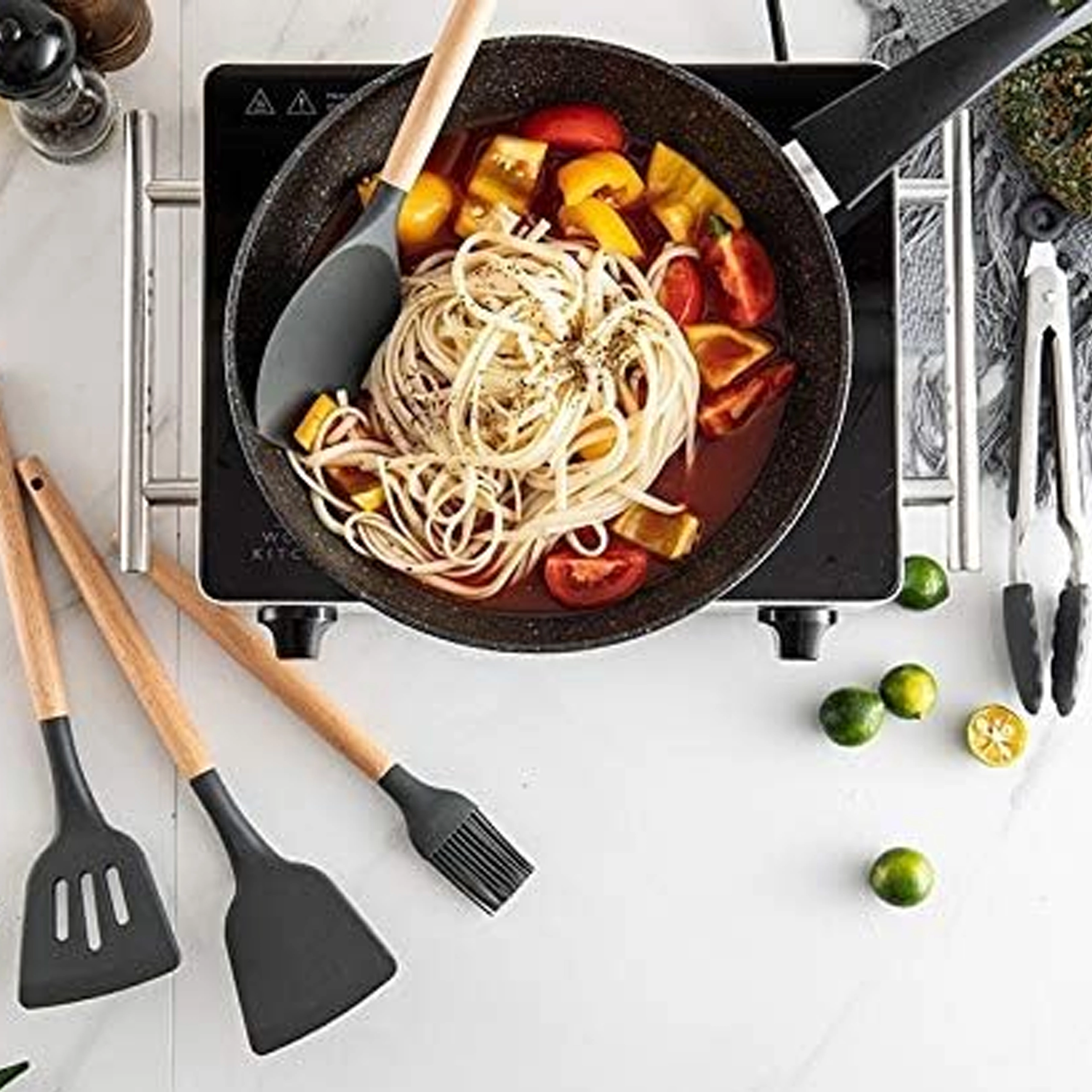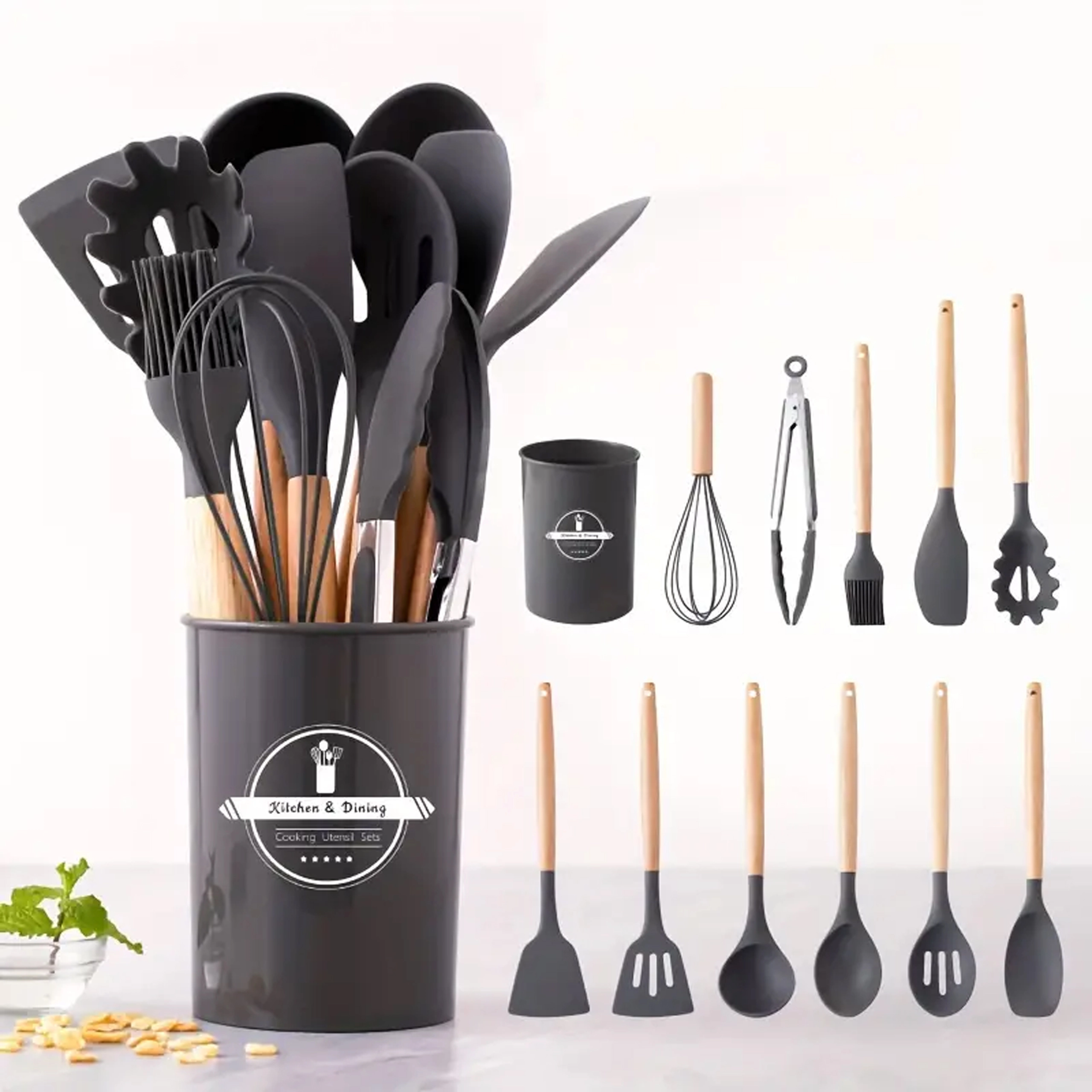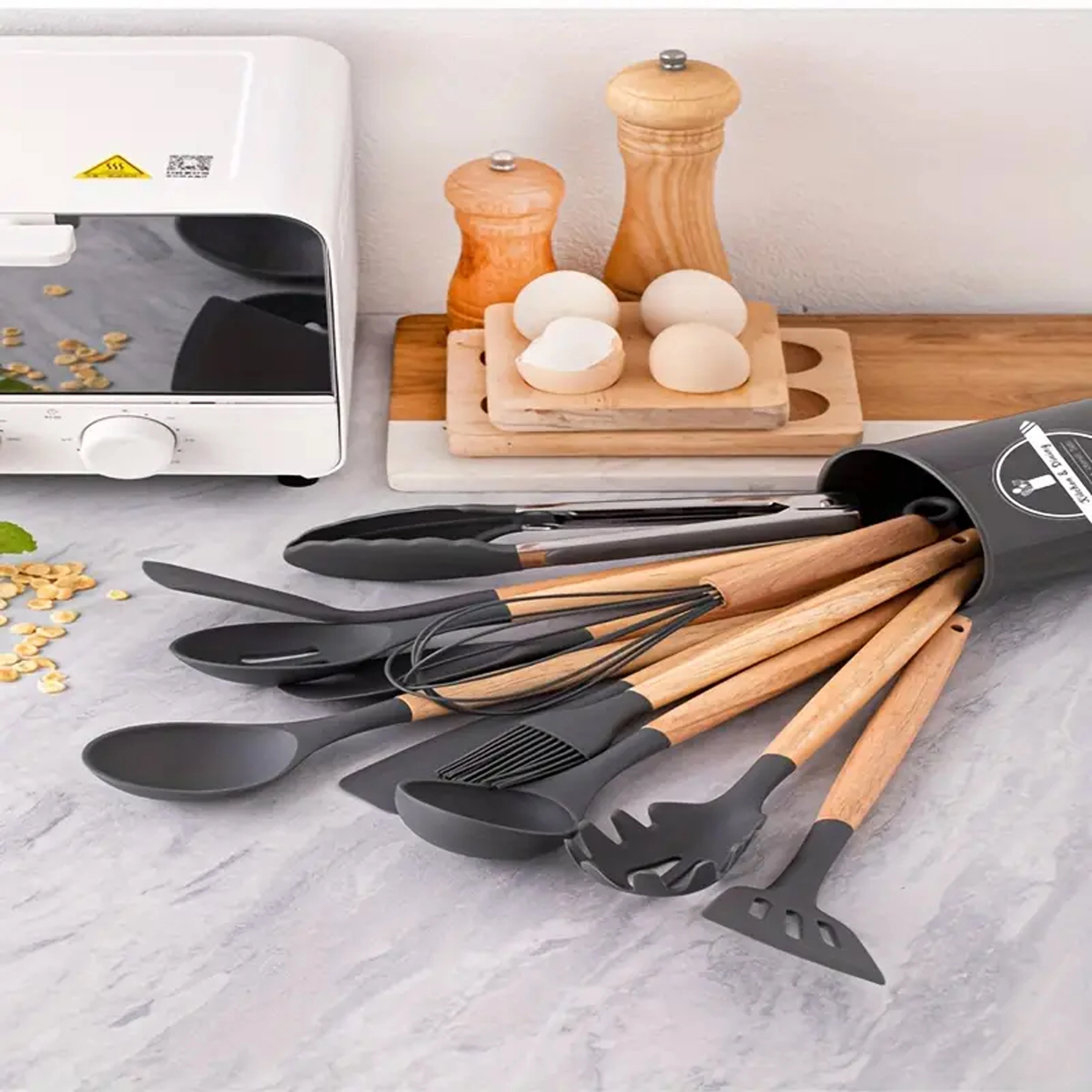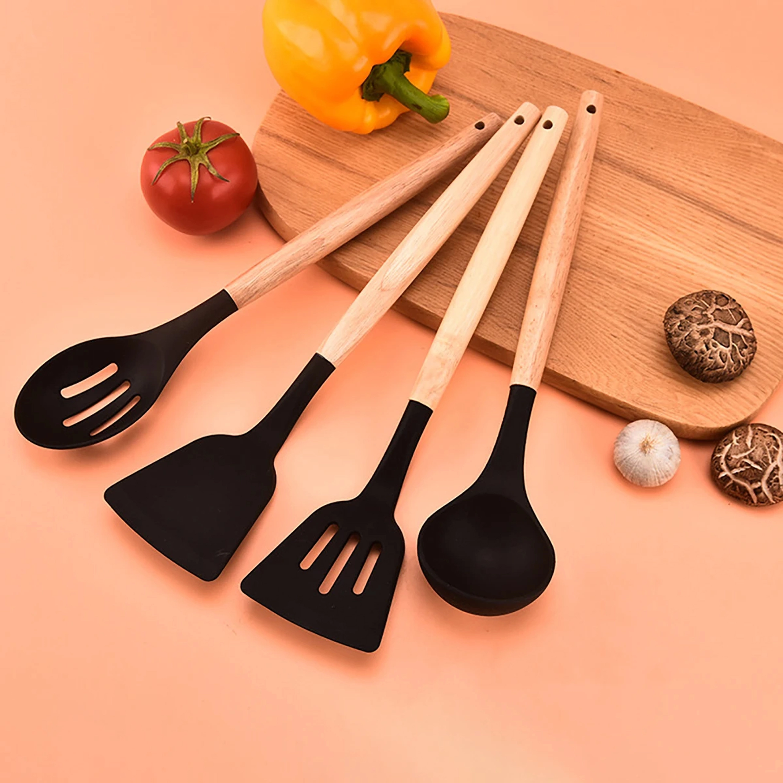 Ovaj svestrani set kuhinjskih alata kombinira izdržljiv silikon s ugodnim prirodnim drvom. Silikonske glave nježne su prema tavama s neprianjajućom površinom i lako se čiste, dok drvo osigurava siguran i udoban hvat. Set pokriva većinu zadataka pri kuhanju i pečenju – od miješanja umaka do posluživanja tjestenine.