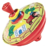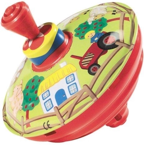 Ovaj tradicionalni glazbeni zvrk s motivom seoskog imanja idealna je igračka za najmlađe. Jednostavan mehanizam pritiska poluge zavrti zvrk, koji pri okretanju stvara karakterističan zvuk i vizualne poticaje.