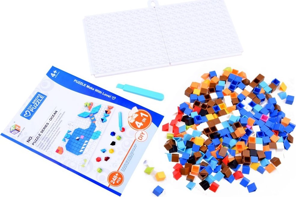 Ova mozaik slagalica 4u1 idealna je za djecu koja vole stvarati i rado se igraju bojama. Zahvaljujući plastičnim „piksel“ kockicama mogu složiti pripremljene morske motive ili izrađivati vlastite slike prema mašti. Dijelovi se jednostavno utiskuju na podlogu sa „studovima“, a gotovu sliku moguće je objesiti pomoću priloženog držača.