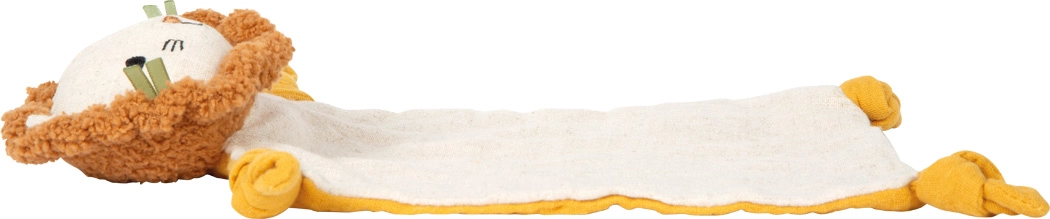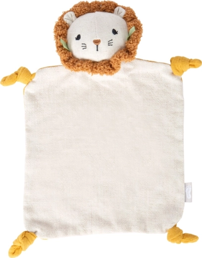 Ova mekana tješilica od ugodne muslinske tkanine spaja umirujuću dekicu, mazilicu za spavanje i senzornu igračku u jednom. Plišana glavica lavića s izvezenim detaljima djeluje prijateljski i sigurno, dok teksturirana površina potiče prirodnu znatiželju i razvoj osjeta dodira.