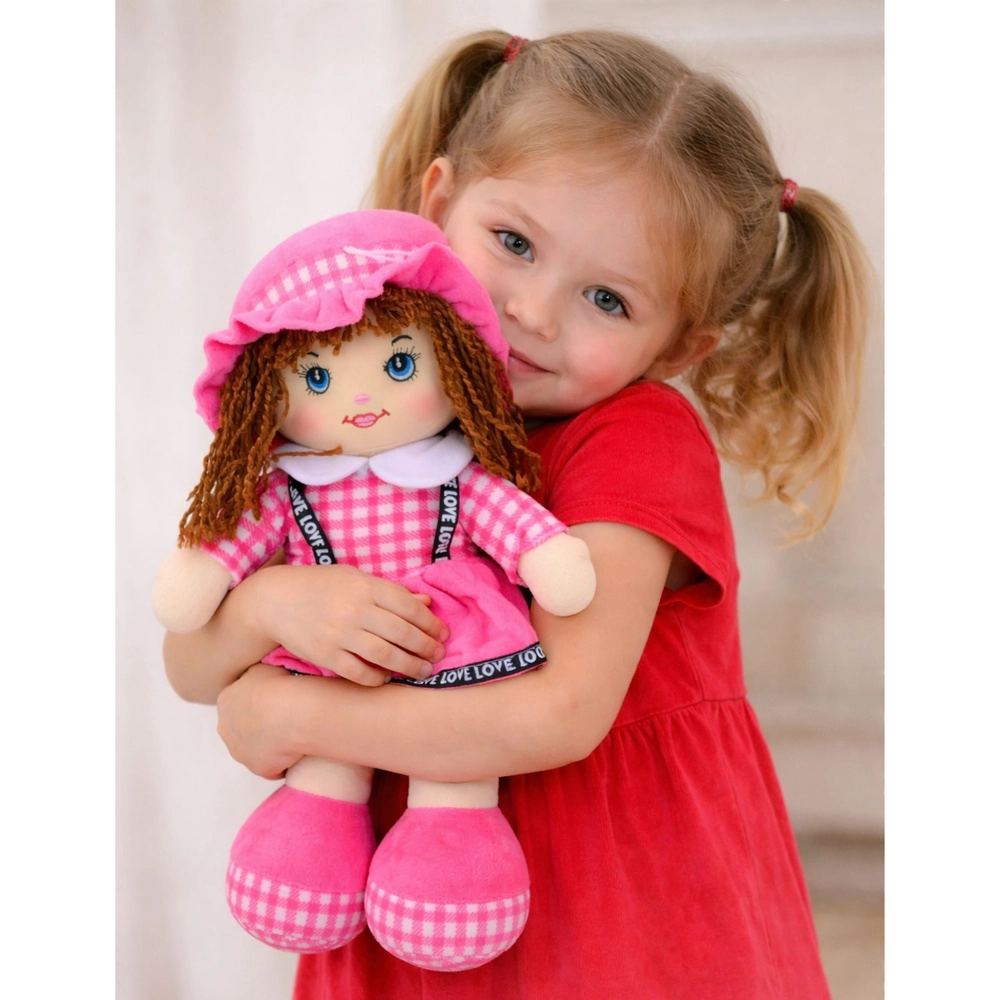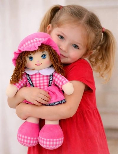 Ova nježna lutka u ružičastoj kariranoj haljini razveselit će djecu od najranije dobi. Zahvaljujući laganoj i mekoj izradi lako se drži, nosi i grli, čime potiče osjećaj sigurnosti i emocionalni razvoj. Kratka pređena kosica, vezeno očišce i osmijeh daju lutki drag izraz i osiguravaju sigurnu igru bez oštrih elemenata.