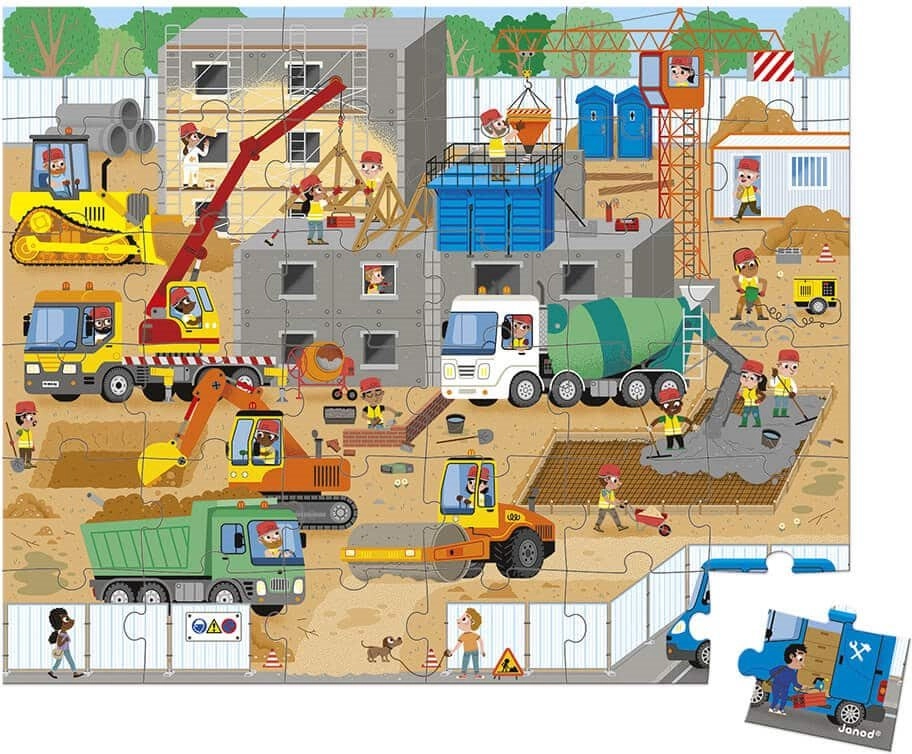 Stilske kartonske puzzle JANOD s motivom gradilišta razveselit će male graditelje i ljubitelje strojeva. Pakirane su u čvrstom koferu s ručkom, pa su odlične za putovanja i spremanje kod kuće. Dio pakiranja je i plakat-predložak koji pomaže djeci pri orijentaciji tijekom slaganja.