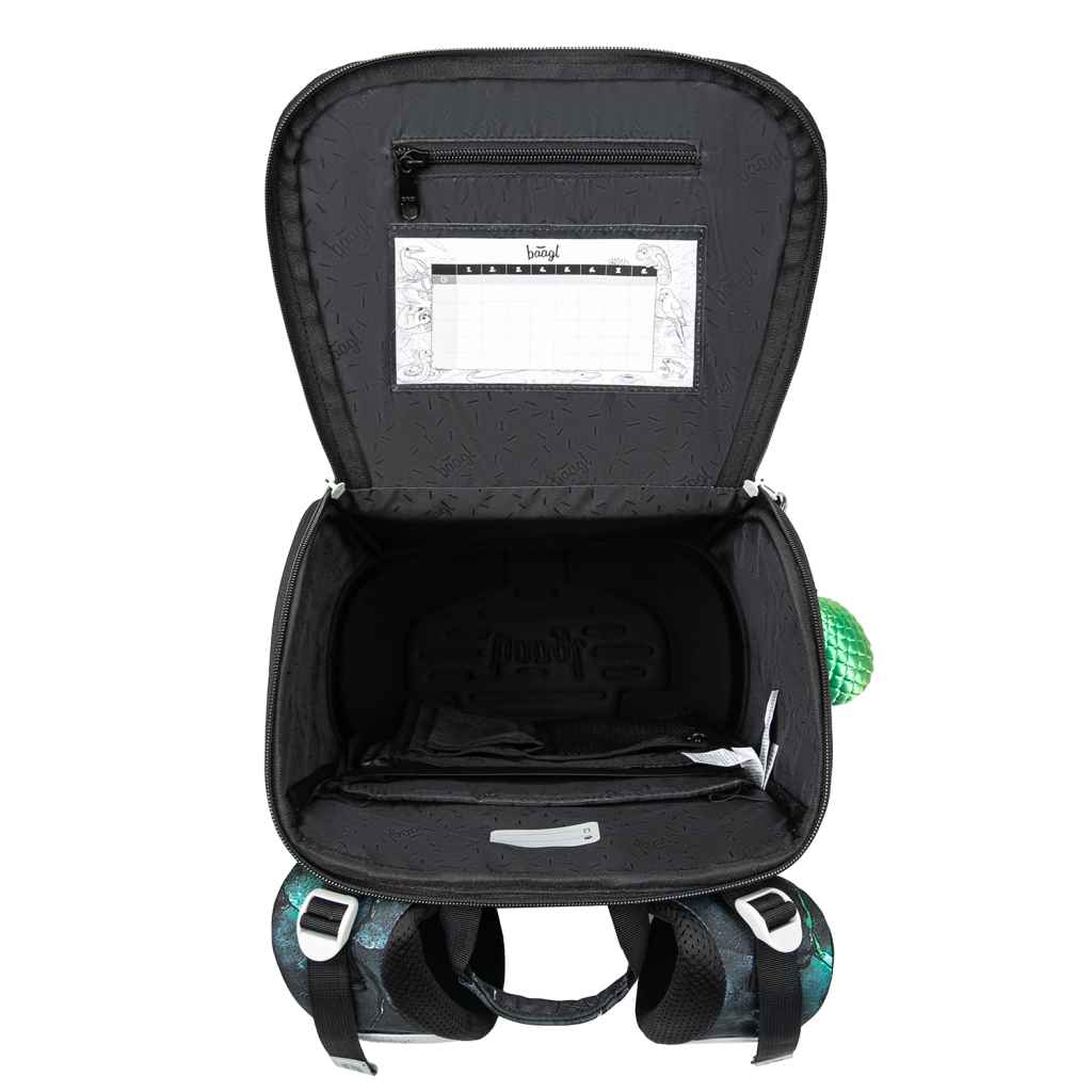 Unutarnji prostor praktično je organiziran, s gumicom za fiksiranje udžbenika i bilježnica bliže težištu tijela. Preklopni sustav otvaranja omogućuje lak pristup priboru izravno s klupe, dok bočni džepovi od čvrstog materijala mogu primiti i bocu za piće. Tu su i sigurnosni reflektirajući elementi za dobru vidljivost, pouzdani YKK patentni zatvarači i čvrsto dno zahvaljujući kojem aktovka samostalno stoji.