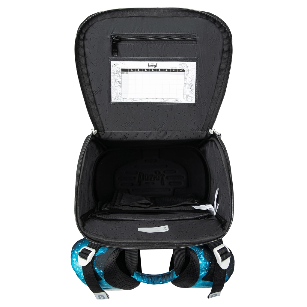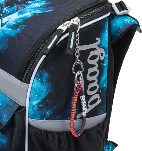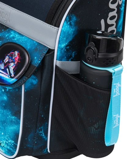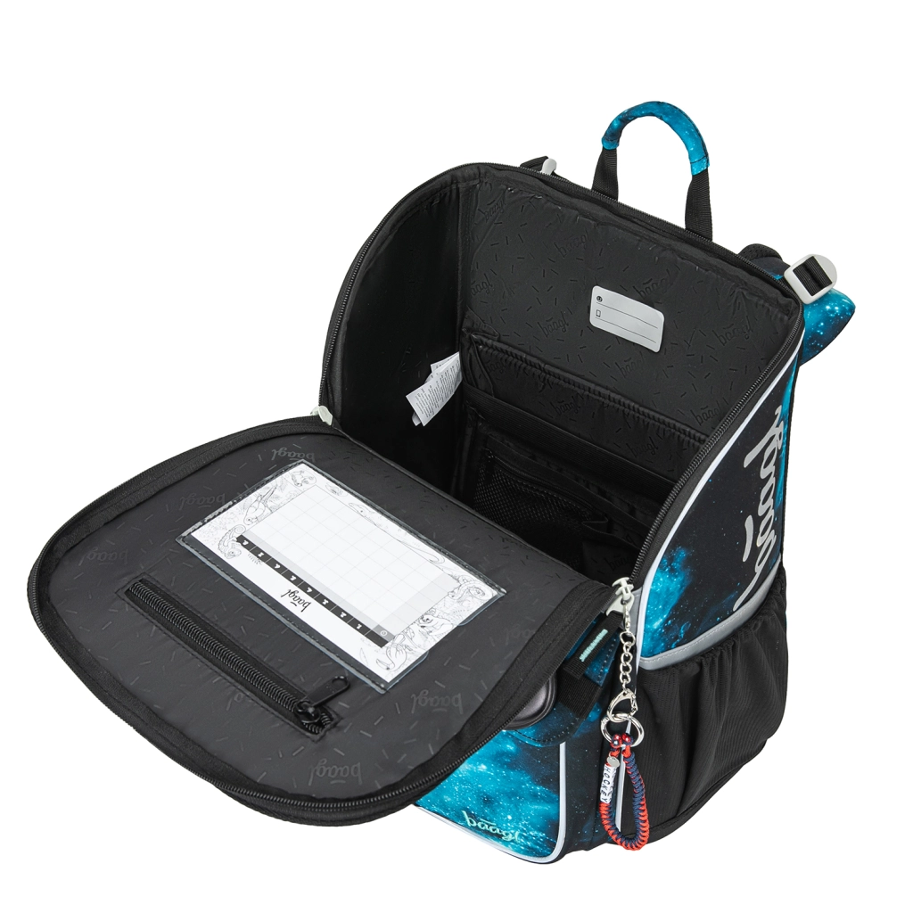 Pametni preklopni sustav otvaranja omogućuje lak pristup bilježnicama izravno s klupe. Unutra se nalazi fiksacijska gumica koja drži težište blizu leđa te pregledna organizacija. Bočni džepovi od čvrstog materijala idealni su za bocu za piće. Reflektirajući elementi povećavaju sigurnost pri slabijoj vidljivosti.