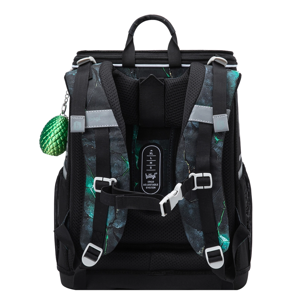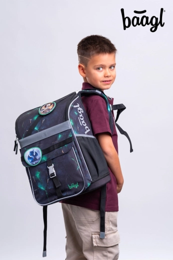 Kompletan školski set BAAGL Zippy Zmajevi za niže razrede osnovne škole spaja stil i praktičnost: ergonomska aktovka s pomičnim sustavom ERGO ADJUSTABLE, izdržljivi zatvarači YKK, lagana konstrukcija, promišljena organizacija i bogata oprema – pernica, vrećica za leđa, dječja pregača i novčanik za oko vrata u ujednačenom zmajskom dizajnu.