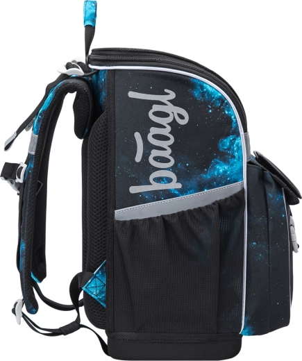 Preklopni poklopac za udobno umetanje s klupe, prostrana glavna komora s unutarnjim džepom, mrežasti džep u poklopcu, gumica za fiksiranje udžbenika i bočni džepovi za bocu.